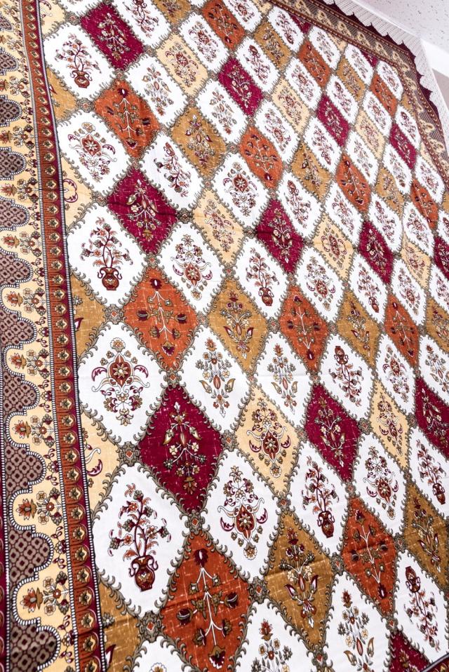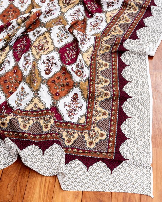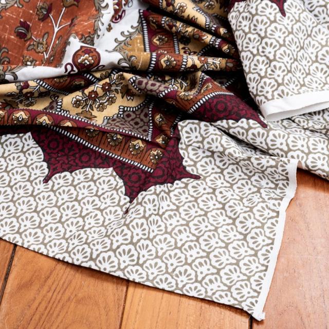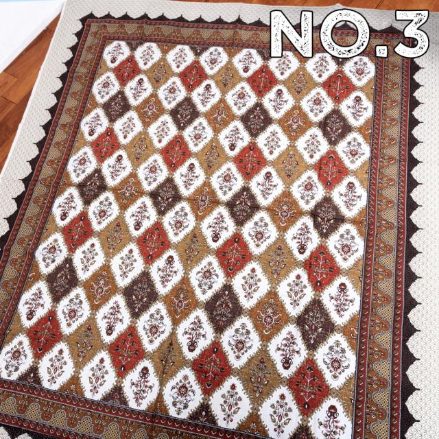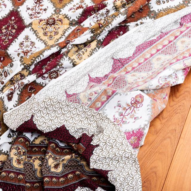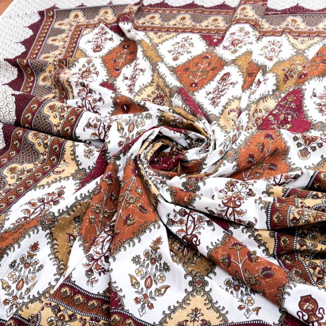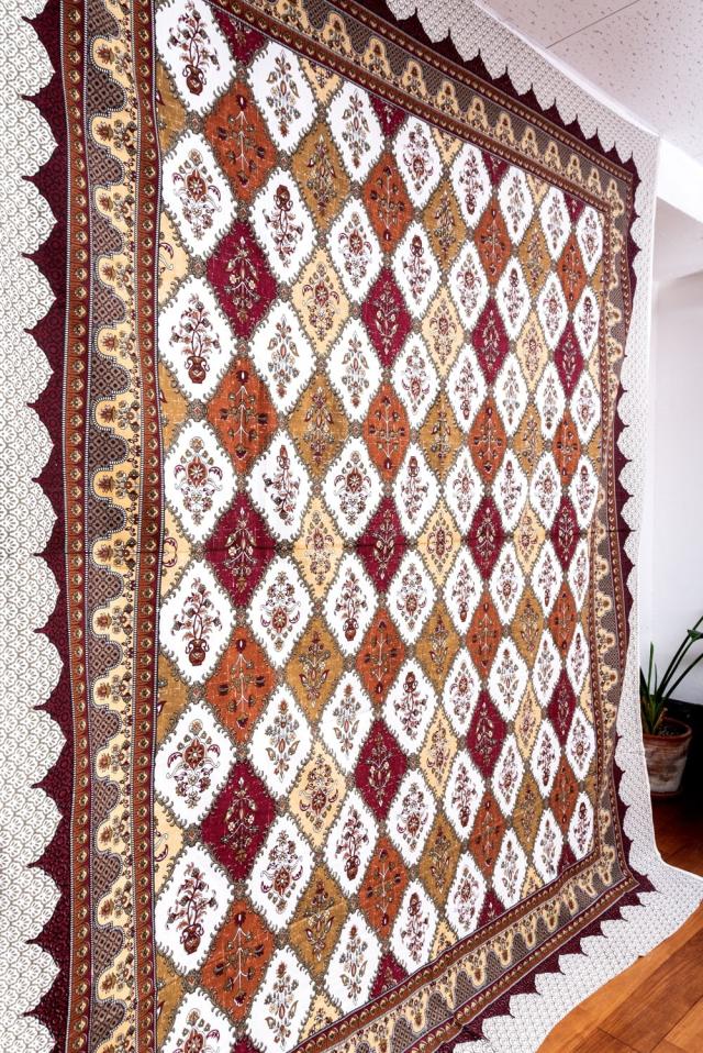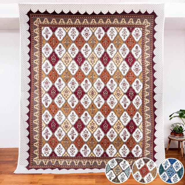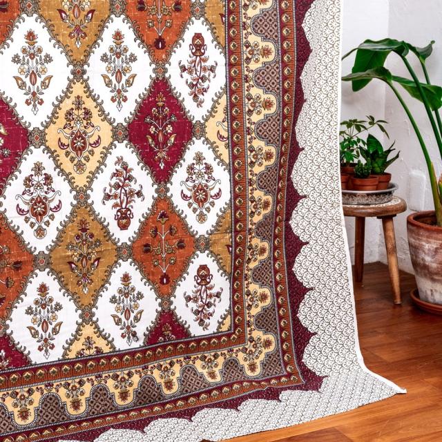 サイズは大きく、長い面は190〜200cmを超える迫力のあるダブルベッドサイズ。インド現地ではベッドカバーとして使われているものですが、壁掛けやテーブルクロス、お部屋のカーテン、そしてもちろん、ベットカバーとして幅広くご利用頂けます。