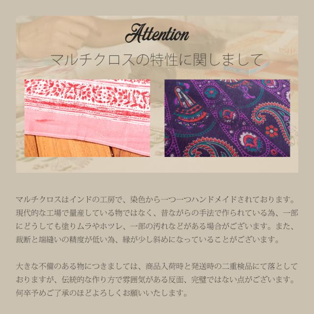 いかにもインドらしいモチーフが魅力的なインド綿のマルチクロスです。インドコットンに、ラクダやゾウ、ペイズリーやマンダラ模様など、インドならではのデザインをプリントしました。