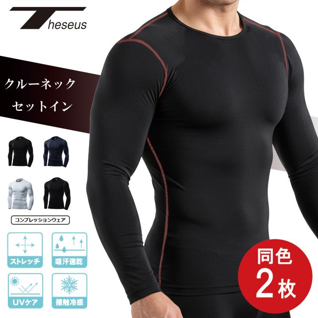 メンズ コンプレッション 長袖 ゴルフシャツ 同色2枚セット シャツ インナー ウェア スポーツ ジム ジョギング ランニング サッカー ウェア ゴルフ スーツ 下着 春 夏 秋 冬 冷感 速乾 軽量 伸縮性 THESEUS テセウス TN11