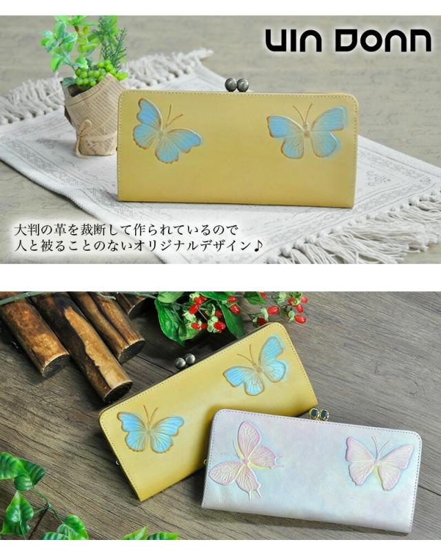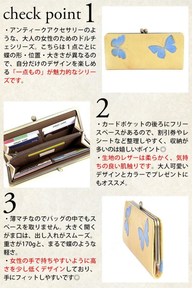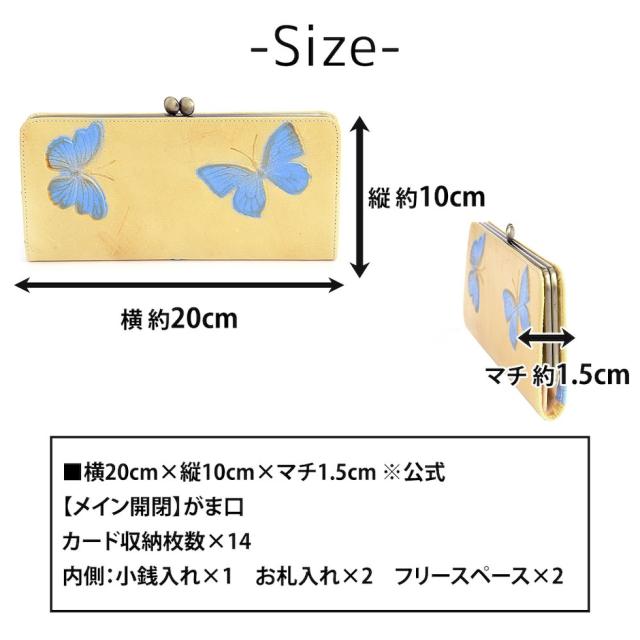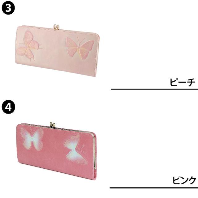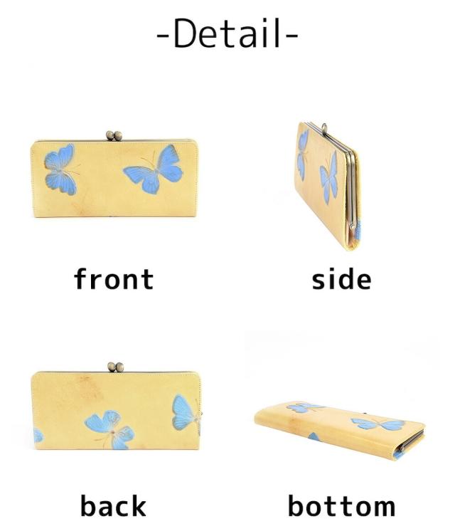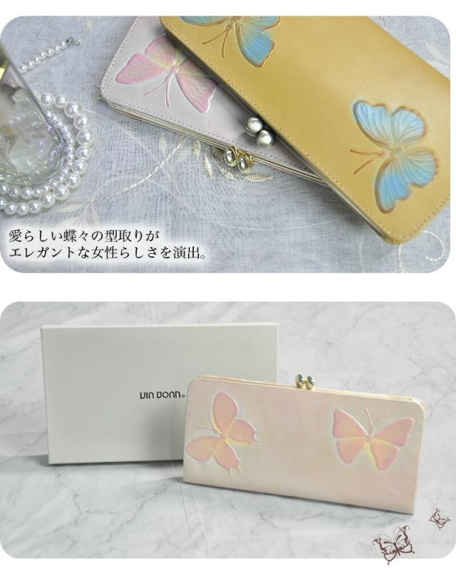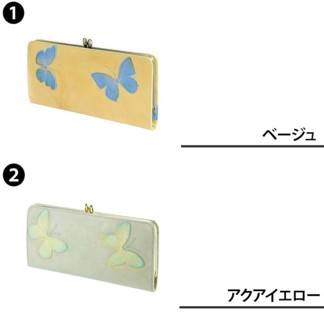 イタリアンレザーに華やかな蝶が舞う個性的な意匠が魅力のがま口長財布。