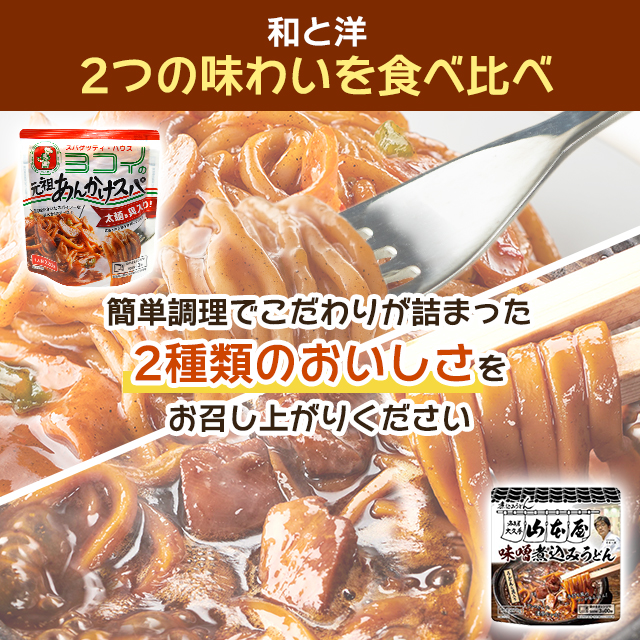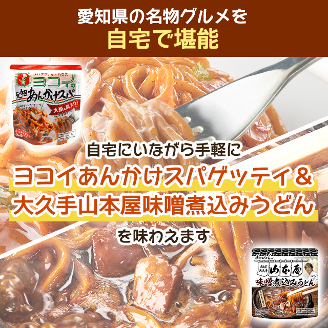・愛知名物「ヨコイあんかけスパゲッティ&大久手山本屋味噌煮込みうどん」のアソートセットをお届けします。