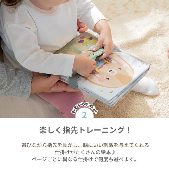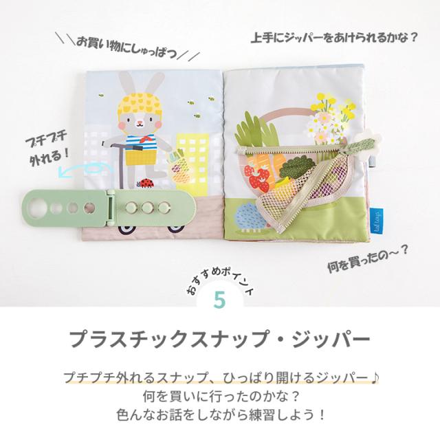 【特徴】しかけがいっぱいの布絵本で、楽しく指先トレーニング!バックルやジッパー、ボタンかけなどのしかけあそびを通して、日常生活で必要な手指の動きや、道具を扱う力加減が学べます。