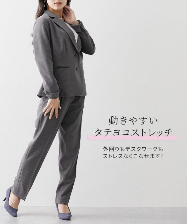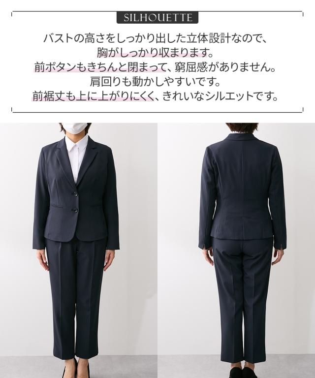 バスト部分を+10cm対応で、ボタンが無理なく閉まって、きれいなラインに! 充実多機能が自慢の『RISPY』ベーシックパンツスーツがお値打ち価格で新登場です。 ・窮屈感のない快適な着心地を叶えるストレッチ素材「リスピィ(R)」を使用したスーツ 「リスピィ(R)」は帝人フロンティア(株)の登録商標です。 ・リスピィスーツは、1:タテヨコストレッチ2:吸汗速乾性3:防しわ性4:ウォッシャブル5:UVカットと誰もが求めた充実の機能性。 ・すっきりとしたバランスの良い丈感で脚長効果もある2ボタンレギュラー丈ジャ