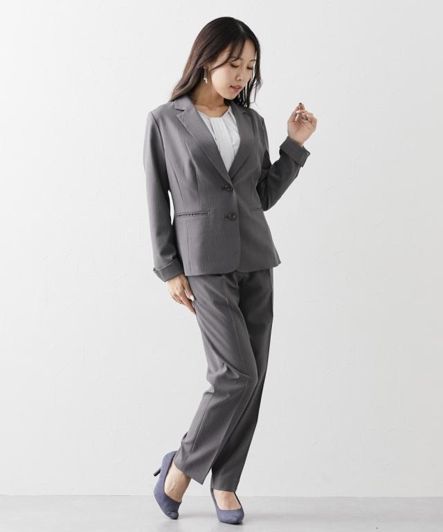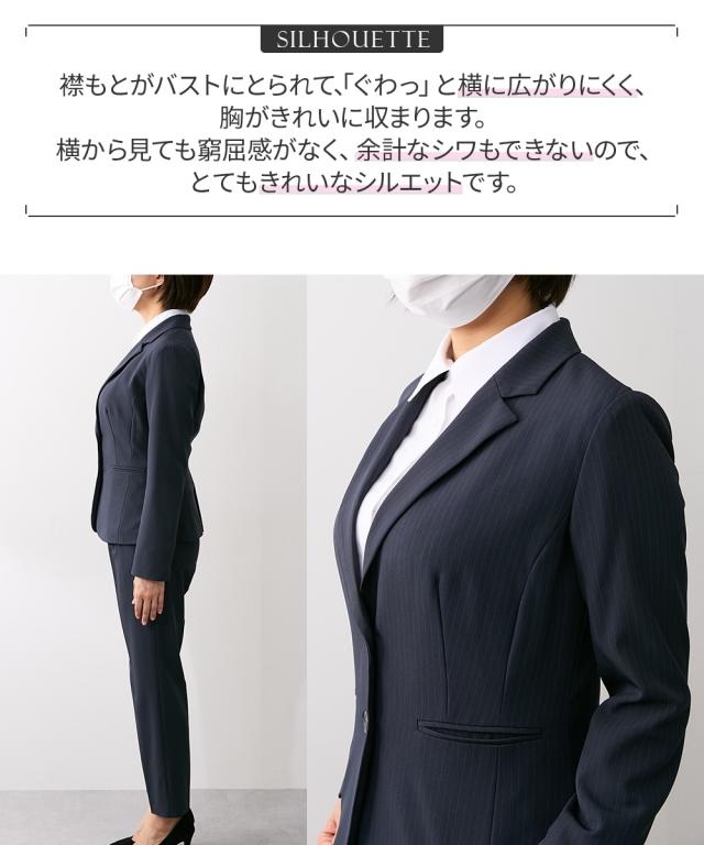 バスト部分を+10cm対応で、ボタンが無理なく閉まって、きれいなラインに! 充実多機能が自慢の『RISPY』ベーシックパンツスーツがお値打ち価格で新登場です。 ・窮屈感のない快適な着心地を叶えるストレッチ素材「リスピィ(R)」を使用したスーツ 「リスピィ(R)」は帝人フロンティア(株)の登録商標です。 ・リスピィスーツは、1:タテヨコストレッチ2:吸汗速乾性3:防しわ性4:ウォッシャブル5:UVカットと誰もが求めた充実の機能性。 ・すっきりとしたバランスの良い丈感で脚長効果もある2ボタンレギュラー丈ジャ