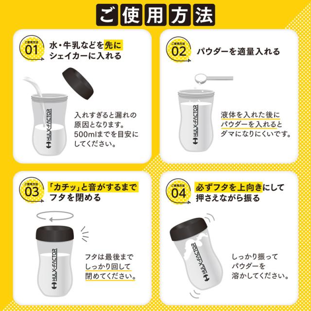 | 1.シェイカーに水や牛乳などを入れます。 2.プロテインやEAA、BCAA、グルタミン、クレアチンなどの粉末を入れます。 3.蓋をしっかりと閉めます。 4.シェイカーをよく振って溶かします。 ※軽く蓋を押さえてください。振って溶かした後は速やかにお召し上がりください。 |
