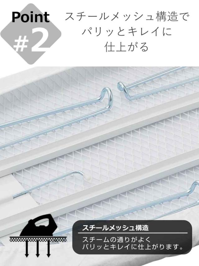本体にメッシュ状の穴が開いており、スチームの通りがいいのでパリッとキレイに仕上がります。また、スチールメッシュ構造は熱に強く丈夫で長持ちします。