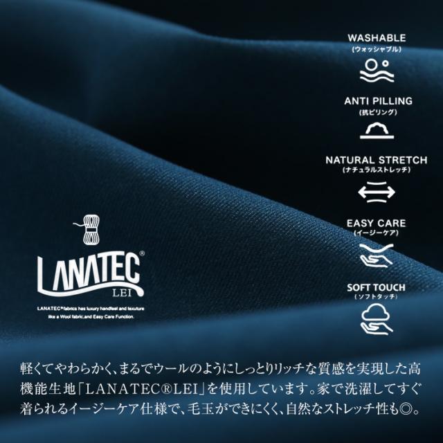 軽くてやわらかく、まるでウールのようにしっとりリッチな質感を実現した高機能生地「LANATEC?LEI」を使用しています。家で洗濯してすぐ着られるイージーケア仕様で、毛玉ができにくく、自然なストレッチ性も◎。