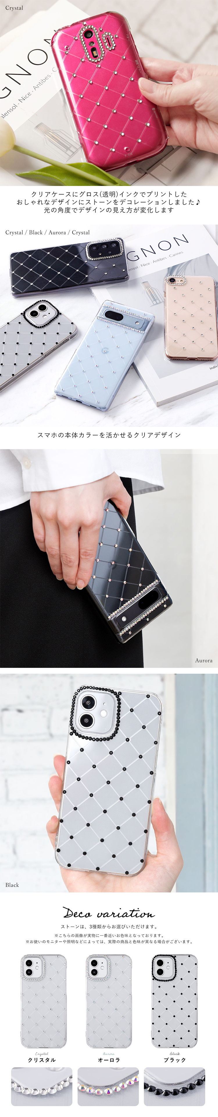 1点ずつ手作業で丁寧にお作りしておりますが、落下や衝撃によりパーツが取れてしまう可能性がございます。 ご希望機種のカメラ穴の形状により端部分にストーンをお付けできない場合がございます。