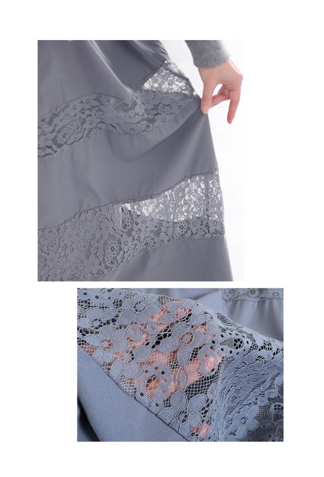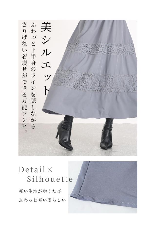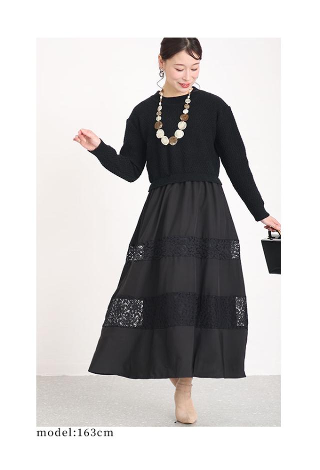 着丈はくるぶしが隠れるくらいです。首元は詰まりすぎないラウンドネックです。袖は伸ばすと手の甲が隠れます。脇グリも身幅も程よい余裕があり楽に着用出来ました。ウエストで切り替わりがあり1枚でニットとスカートをコーデしたようなデザインです。スカートは広がりを抑えたギャザースカートで体型を拾わず楽に着用出来ました。レースと切り替わっているのでティアードのような雰囲気もありロングですが重たく見えません。