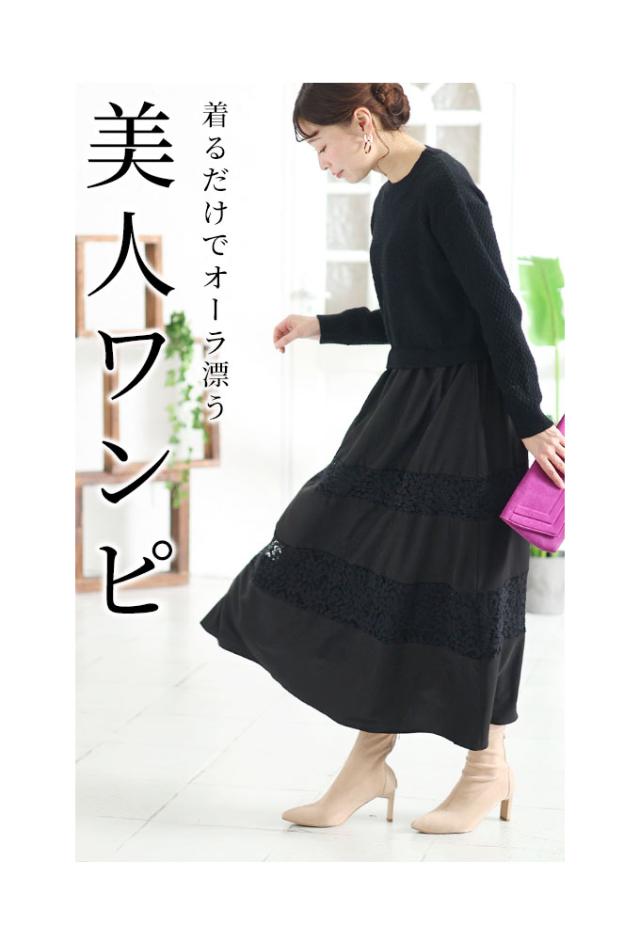 秋新作 着るだけで脚長美人なニット切替フレアワンピース レディース ファッション ワンピース 黒 ブラック グレー 長袖 冬服 大人可愛い 40代 レディースファッション 50代女性 ファッション 60代 ミセスファッション サワアラモード sawaalamode otona aljpn009
