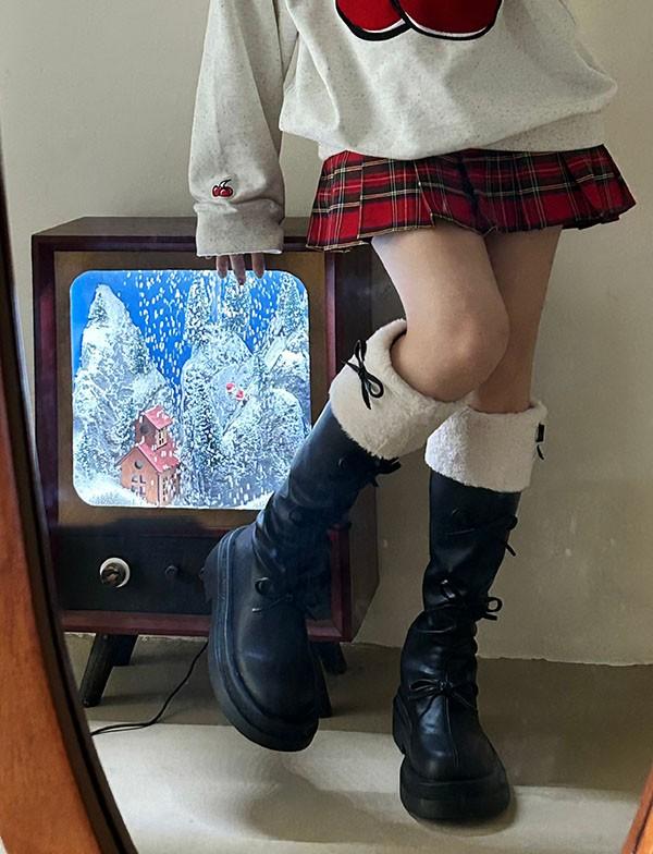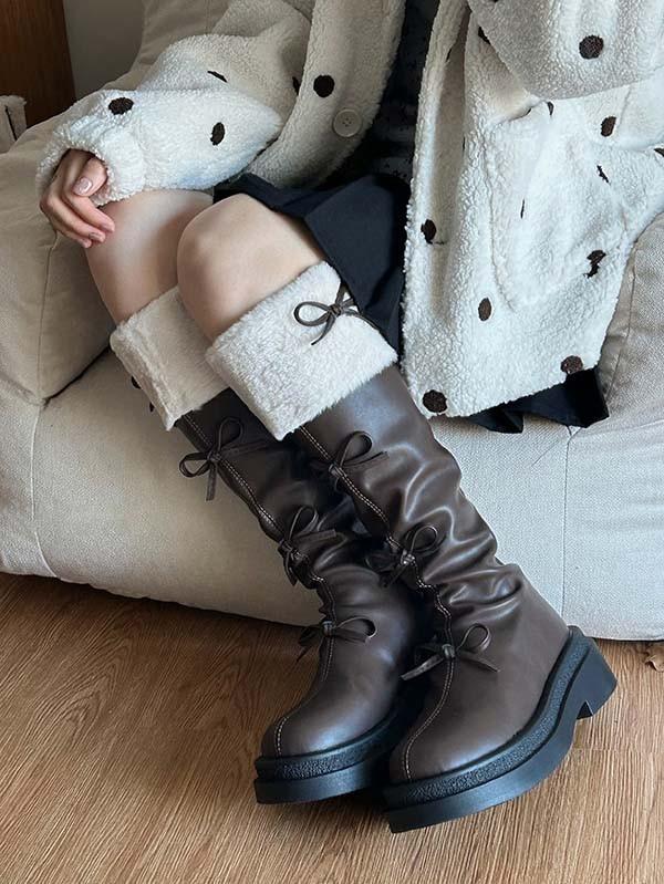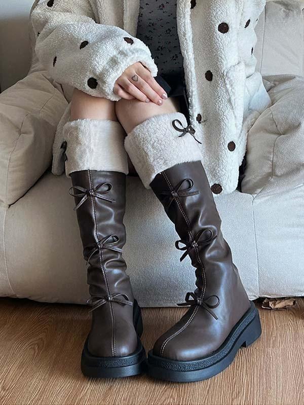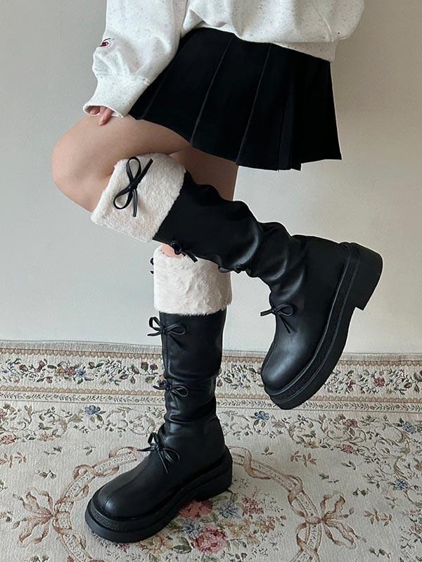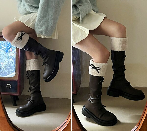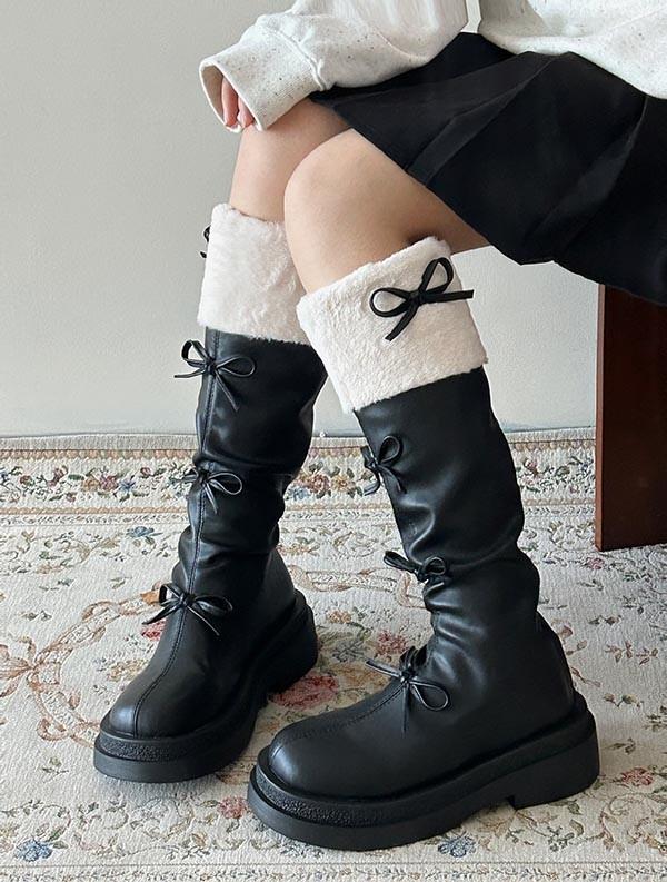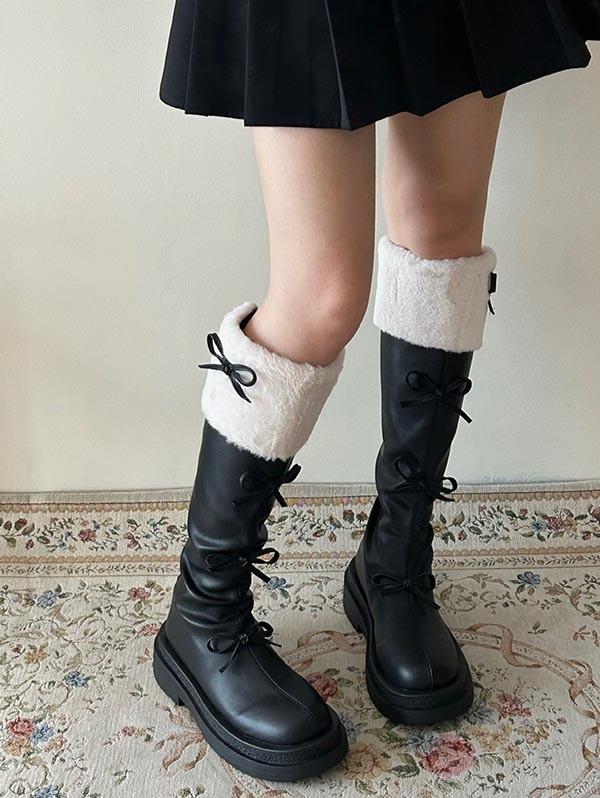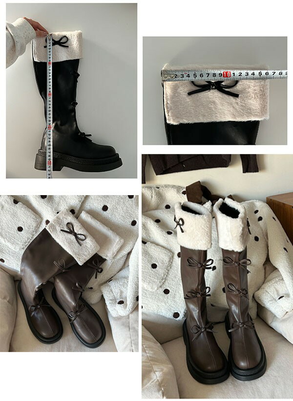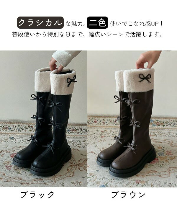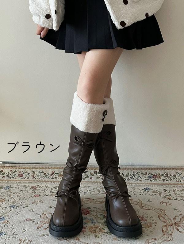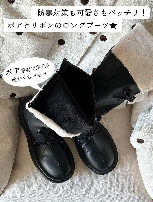ロングブーツ レディース スノーブーツ ボア PU あったか 可愛い ふわふわ もこもこ lolita ロリータ リボン 防寒 通勤 滑りにくい 雪靴 ブラック ブラウン 22.5 23.0 23.5 24.0 24.5