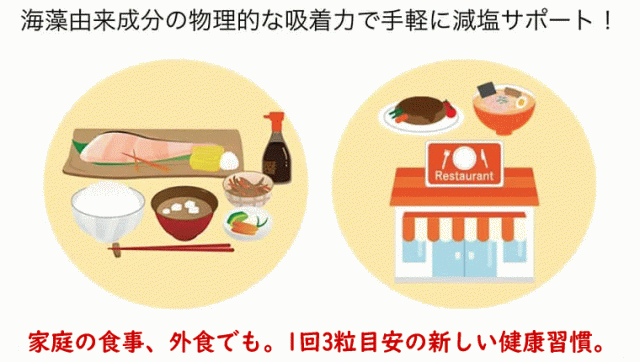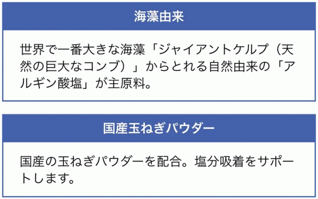 ジャイアントケルプには食物繊維であるアルギン酸塩が豊富に含まれており、食事に含まれる塩分の一部を、体内で吸収される前に物理的に吸着し、そのまま排出されます。