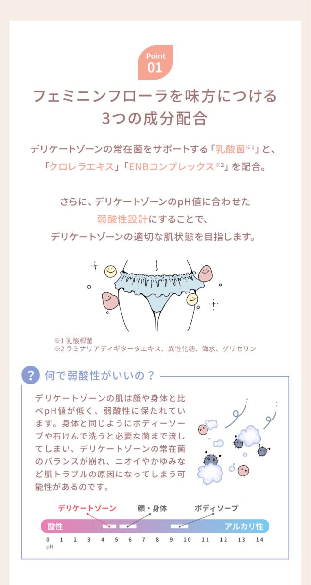 デリケートゾーンの常在菌をサポートする「乳酸菌※」と、「クロレラエキス」「ENBコンプレックス」を配合。