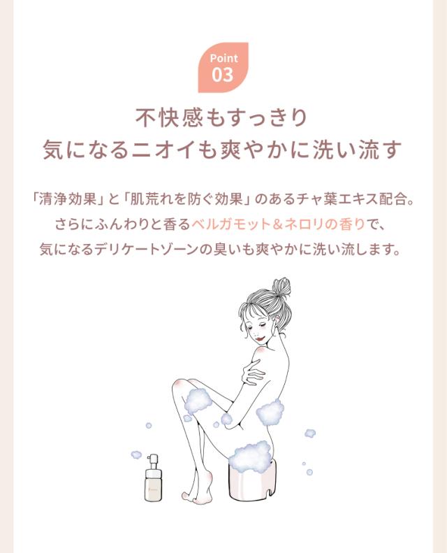 肌にやさしい泡タイプで、乾燥によるくすみを防ぎます。「清浄効果」と「肌荒れを防ぐ効果」のあるチャ葉エキス配合。さらにふんわりと香るベルガモット&ネロリの香りで、気になるデリケートゾーンを爽やかに洗い流します。