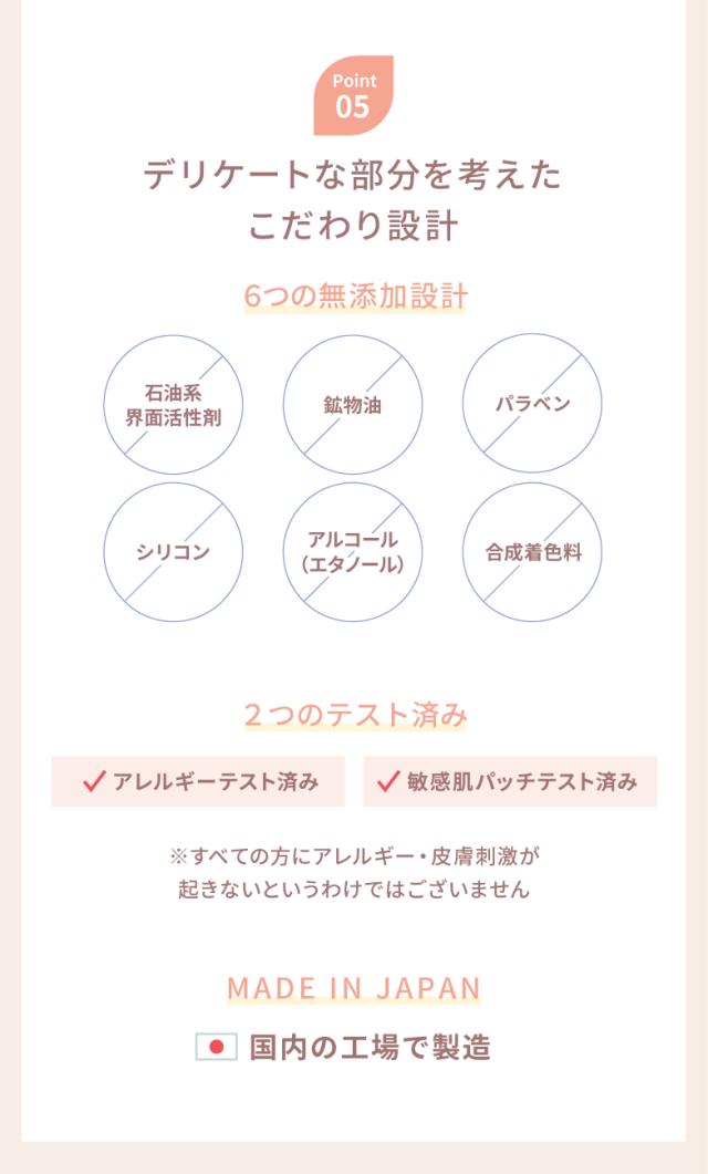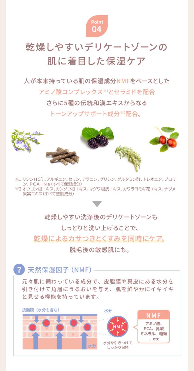 さらに、デリケートゾーンのpH値に合わせた弱酸性設計にすることで、デリケートゾーンの適切な肌状態を目指します。