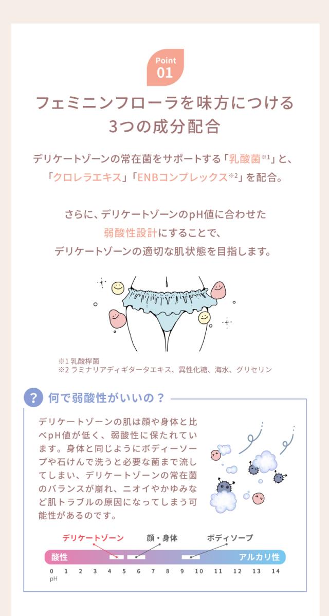 デリケートゾーンの常在菌をサポートする「乳酸菌※」と、「クロレラエキス」「ENBコンプレックス」を配合。