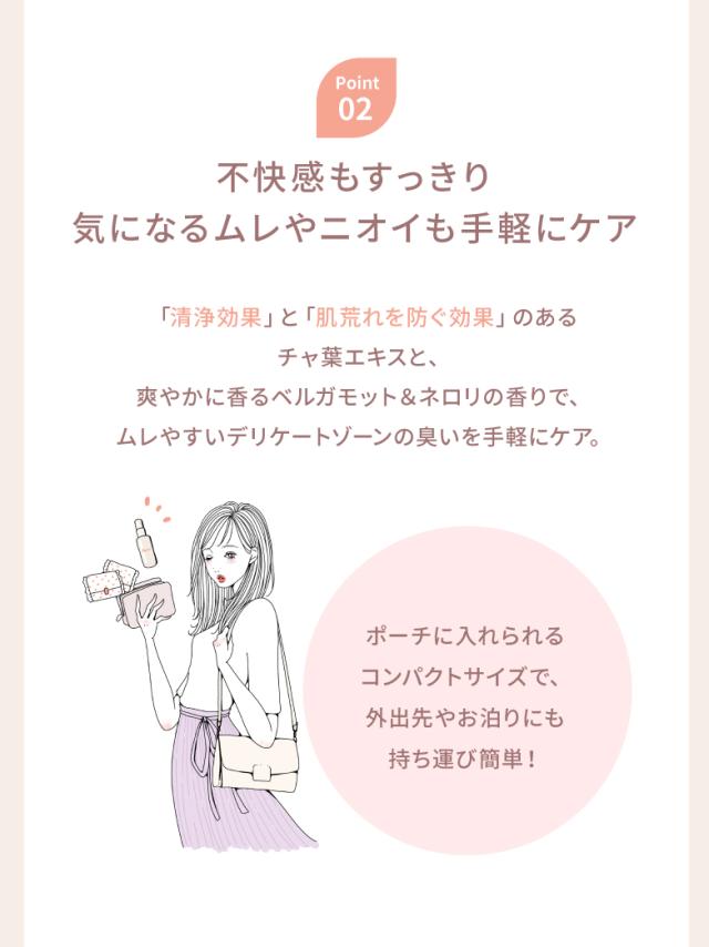 「清浄効果」と「肌荒れを防ぐ効果」のあるチャ葉エキスと、爽やかに香るベルガモット&ネロリの香りで、ムレやすいデリケートゾーンを手軽にケアすることができます。