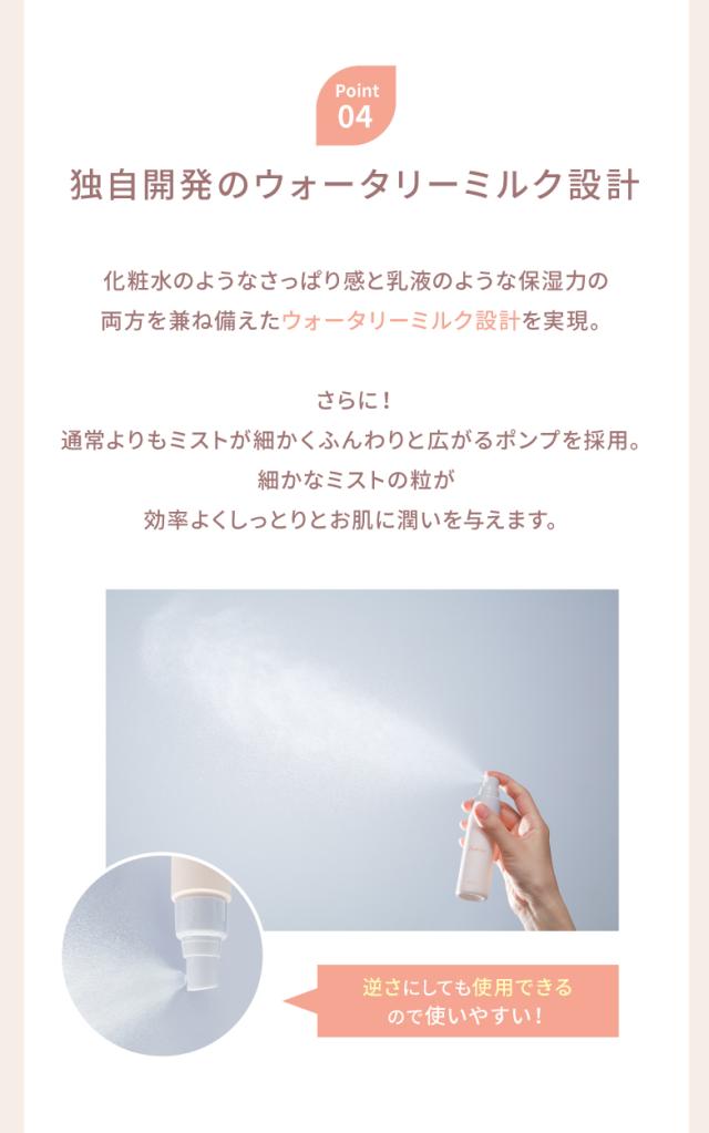 化粧水のようなさっぱり感と乳液のような保湿力の両方を兼ね備えたウォータリーミルク設計を実現。