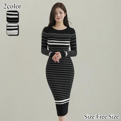 ボーダーリブロングニットワンピース(キャバドレス・CABARETDRESS)。
