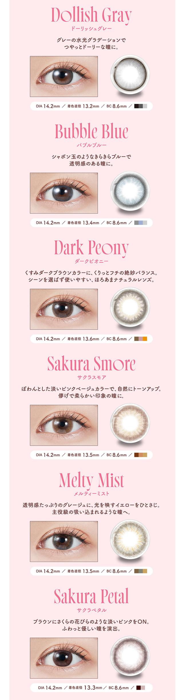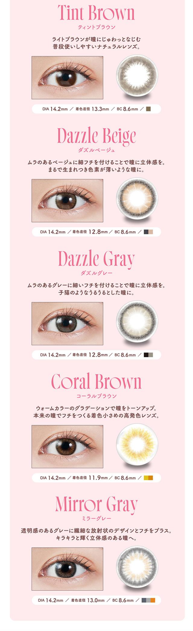 | DIA | 14.2mm:ブラウンバニー/ドーリッシュブラウン/ドーリッシュグレー/バブルブルー/ダークピオニー/サクラスモア/メルティ—ミスト/ダズルベージュ/ダズルグレー/コーラルブラウン/サクラペタル/ミラーグレー/ティントブラウン 14.5mm:トゥインクルブラウン/ピンクボム/ドリームグレー/ユニフォームブラック |