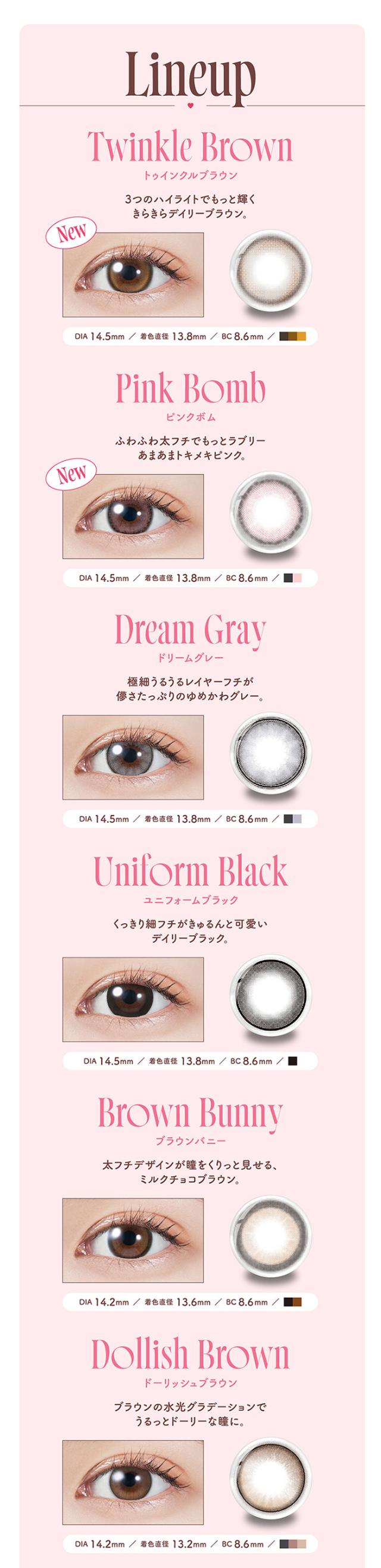 | 着色直径 | 11.9mm:コーラルブラウン 12.8mm:ダズルベージュ/ダズルグレー 13.0mm:ミラーグレー 13.2mm:ドーリッシュブラウン/ドーリッシュグレー 13.3mm:サクラペタル/ティントブラウン 13.4mm:バブルブルー 13.5mm:サクラスモア/メルティーミスト 13.6mm:ダークピオニー/ブラウンバニー 13.8mm:トゥインクルブラウン/ピンクボム/ドリームグレー/ユニフォームブラック |