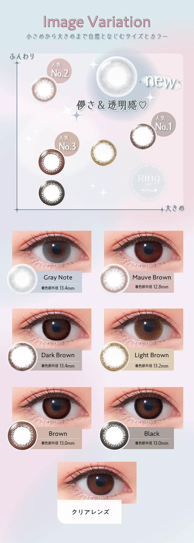 | 着色直径 | 12.8mm:モーヴブラウン 13.0mm:ブラウン/ブラック 13.2mm:ライトブラウン 13.4mm:グレーノート/ダークブラウン |