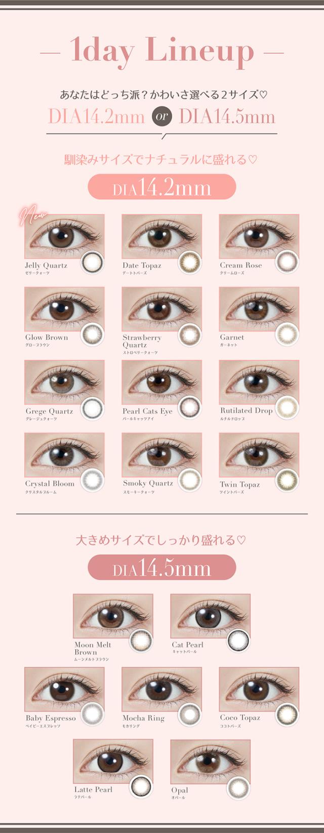 | 着色直径 | 13.2mm :パールキャッツアイ/グレージュクォーツ 13.4mm :デートトパーズ/ツイントパーズ/ルチルドロップ/クリームローズ 13.5mm :ストロベリークォーツ/ガーネット/スモーキークォーツ/クリスタルブルーム/グローブラウン 13.6mm :ゼリークォーツ 13.7mm :ココトパーズ/ラテパール/モカリング/ベイビーエスプレッソ/ムーンメルトブラウン/キャットパール 13.8mm :オパール |