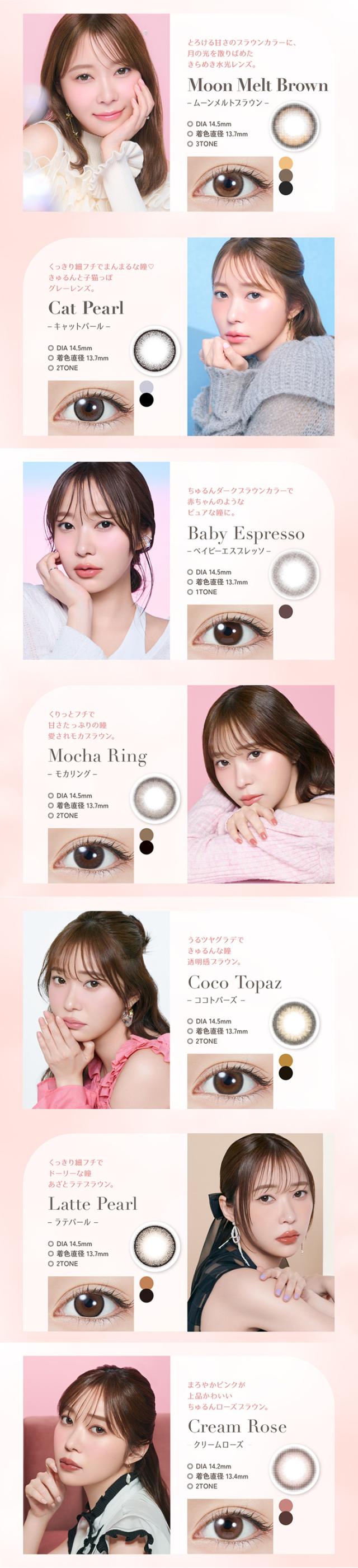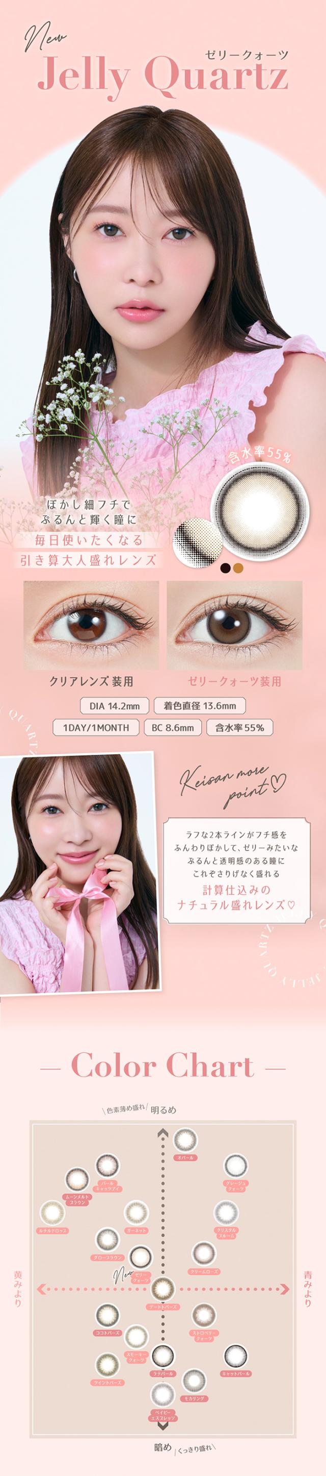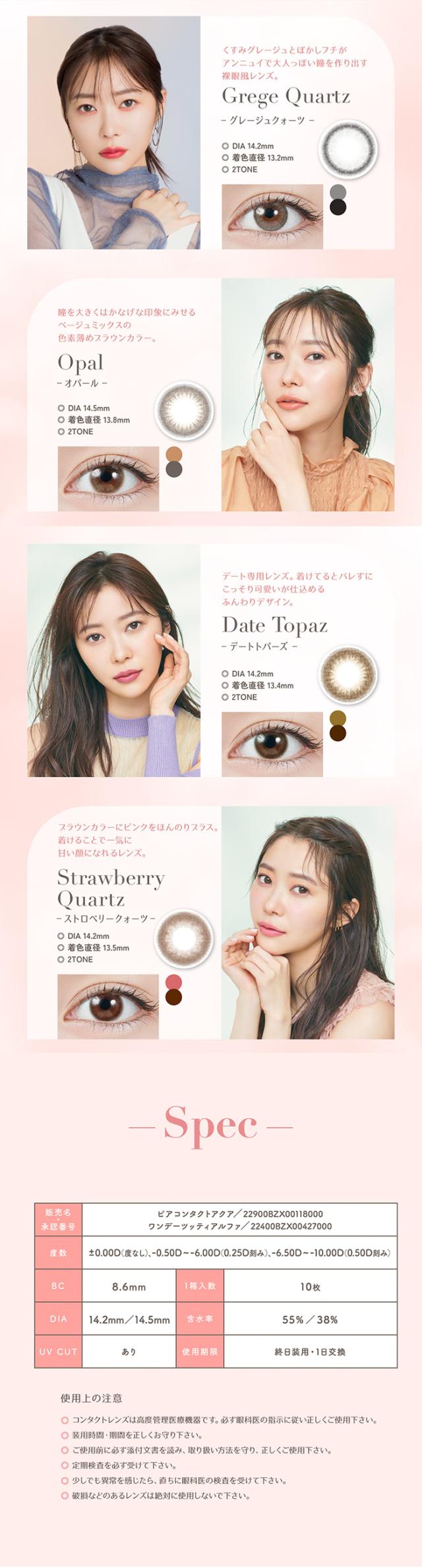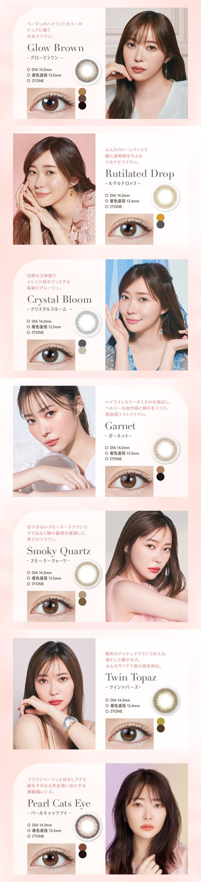 | 含水率 | 38.0%:クリームローズ/グローブラウン/デートトパーズ/ストロベリークォーツ/パールキャッツアイ/グレージュクォーツ/ガーネット/スモーキークォーツ/ツイントパーズ/ルチルドロップ/クリスタルブルーム/オパール/ココトパーズ/ラテパール/モカリング/ベイビーエスプレッソ 55.0%:ゼリークォーツ/ムーンメルトブラウン/キャットパール |