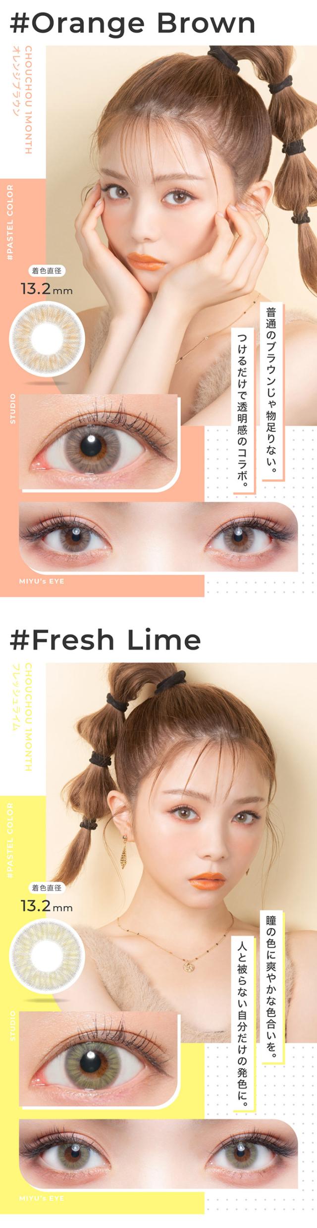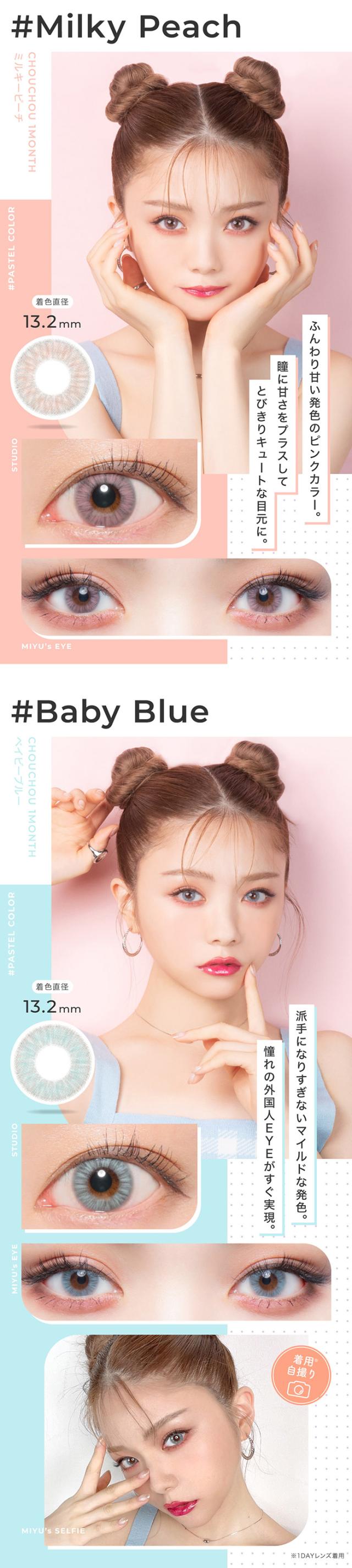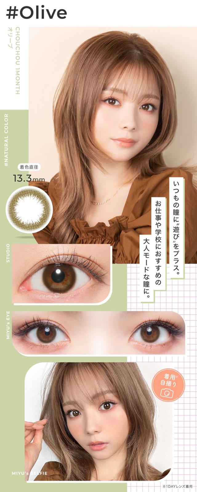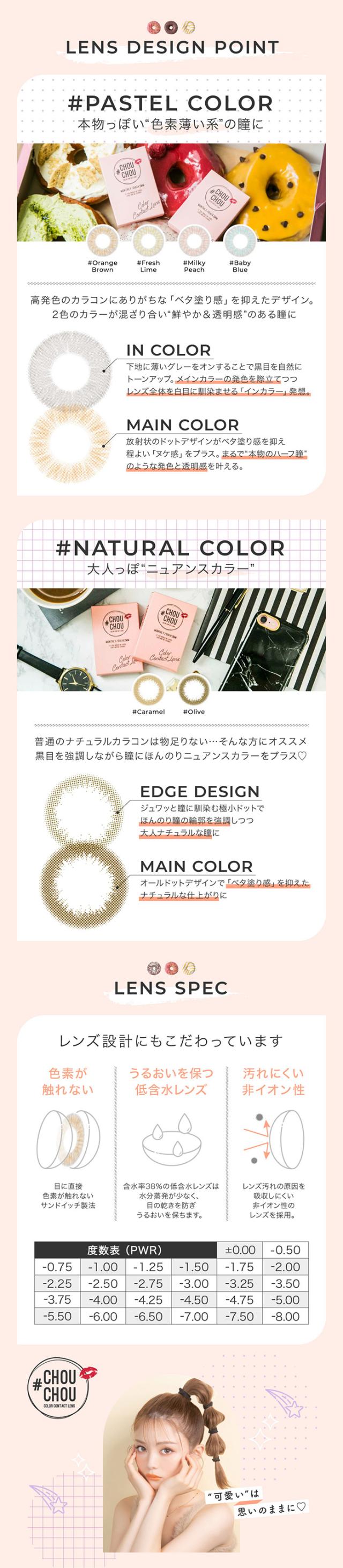 | 着色直径 | 13.2mm:ミルキーピーチ /ベイビーブルー /オレンジブラウン /フレッシュライム 13.3mm:オリーブ /キャラメル |