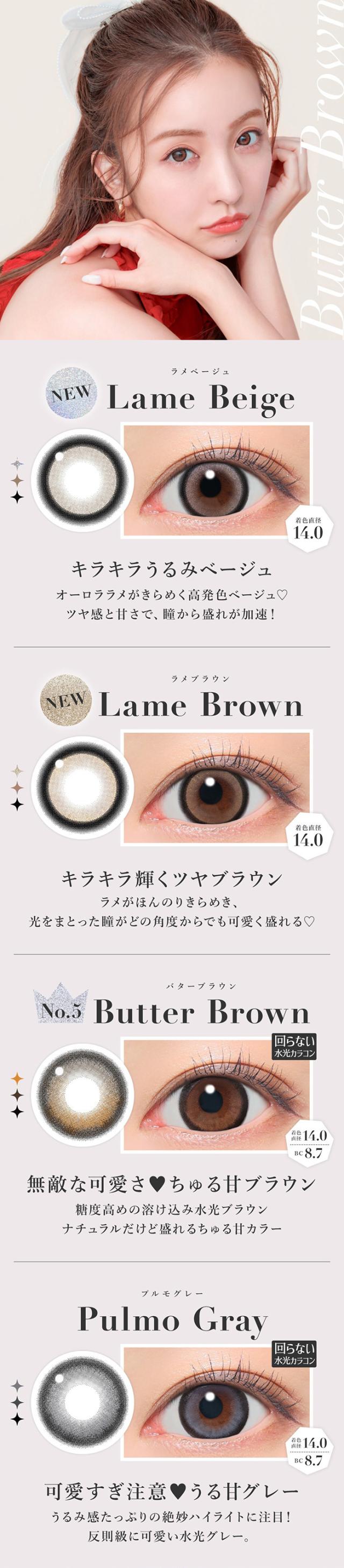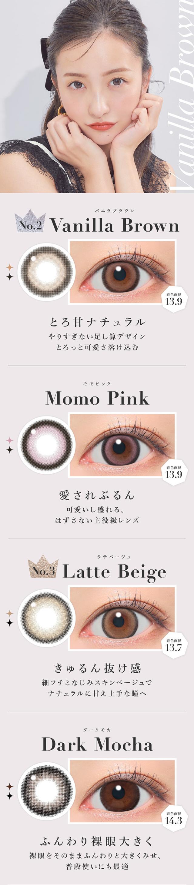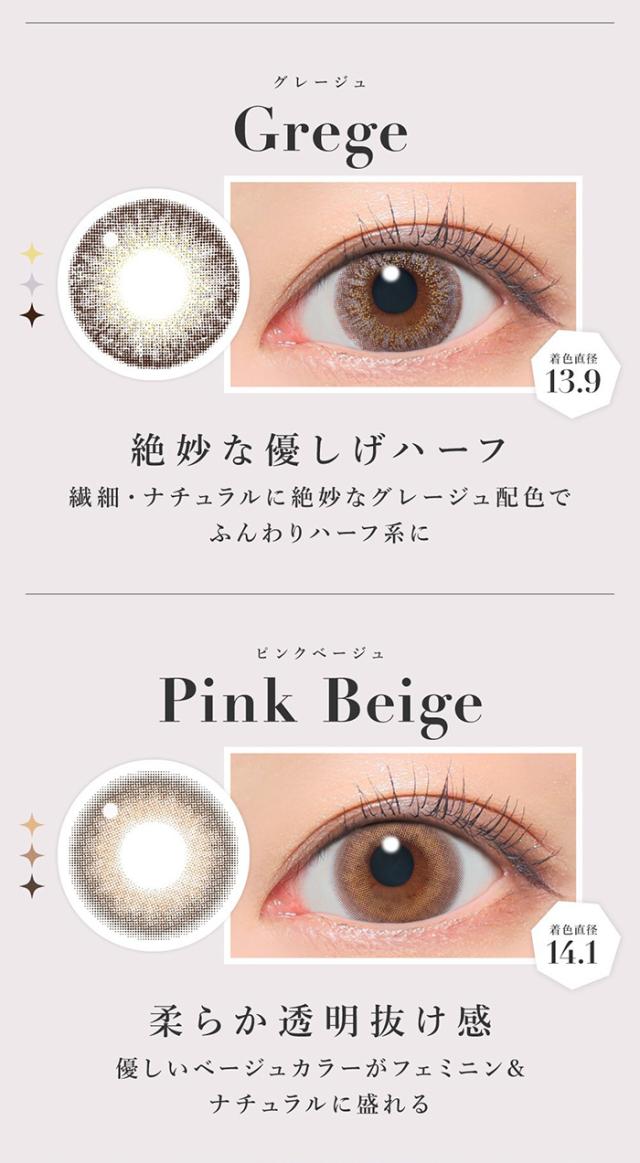 | 着色直径 | 13.7mm:ラテベージュ 13.9mm:バニラブラウン/モモピンク/グレージュ 14.0mm:ラメベージュ/ラメブラウン/バターブラウン/プルモグレー/NO.9ブラウン/クリアグレー/シマーブラウン 14.1mm:ピンクベージュ 14.3mm:ダークモカ/NO.1チョコレート/NO.3ブラウン/NO.5ブラック/NO.6ブラウン/NO.14ヘーゼル |