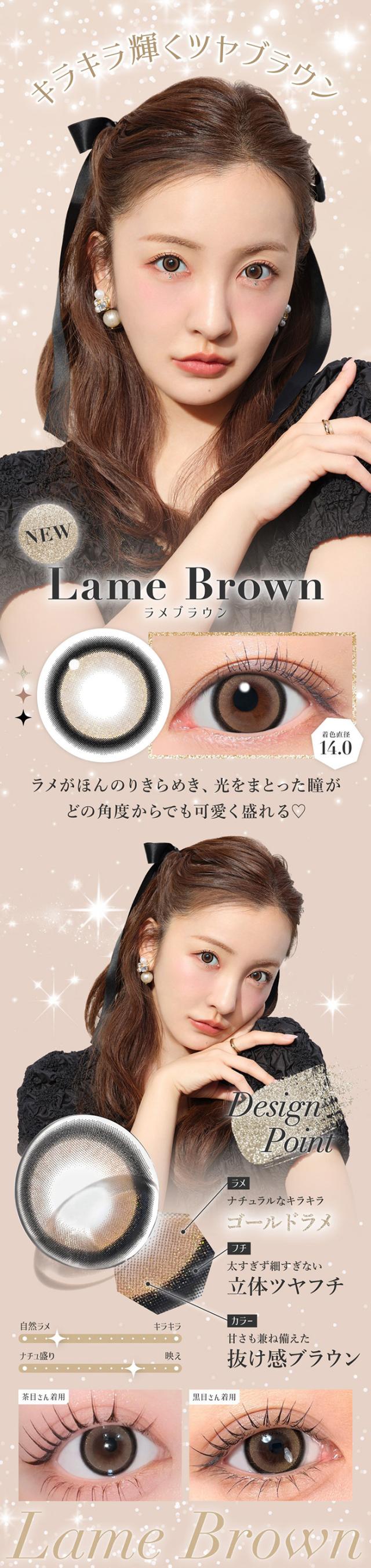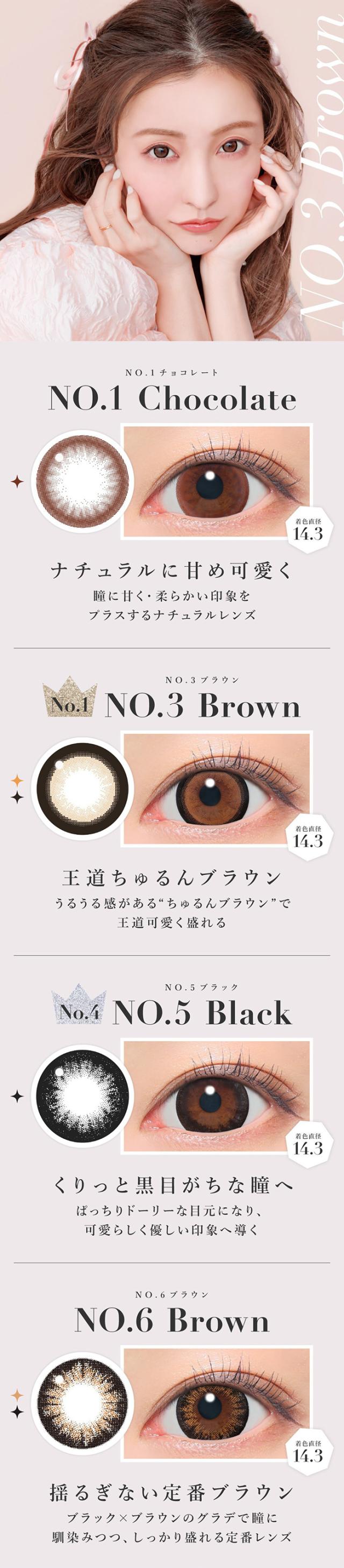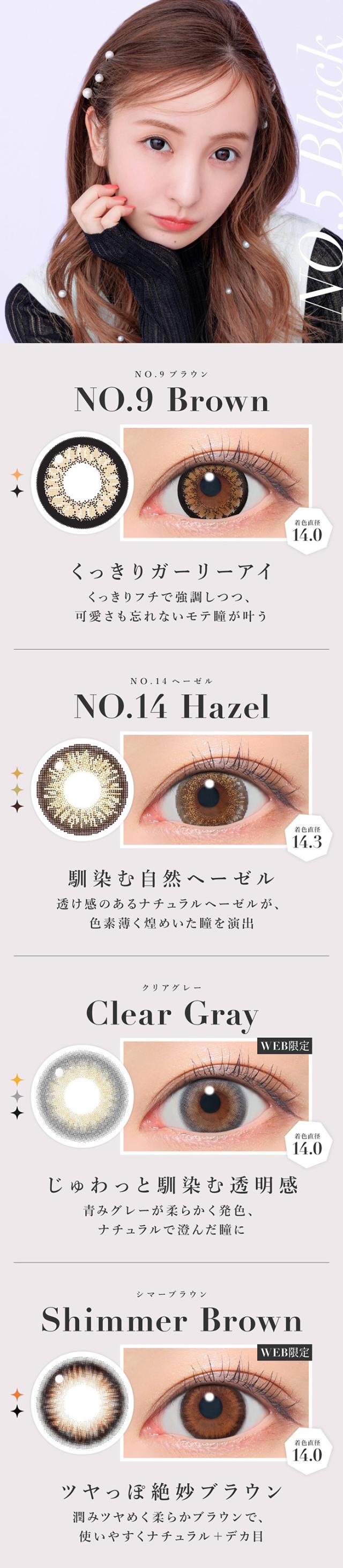 | 着色直径 | 13.7mm:ラテベージュ 13.9mm:バニラブラウン/モモピンク/グレージュ 14.0mm:ラメベージュ/ラメブラウン/バターブラウン/プルモグレー/NO.9ブラウン/クリアグレー/シマーブラウン 14.1mm:ピンクベージュ 14.3mm:ダークモカ/NO.1チョコレート/NO.3ブラウン/NO.5ブラック/NO.6ブラウン/NO.14ヘーゼル |