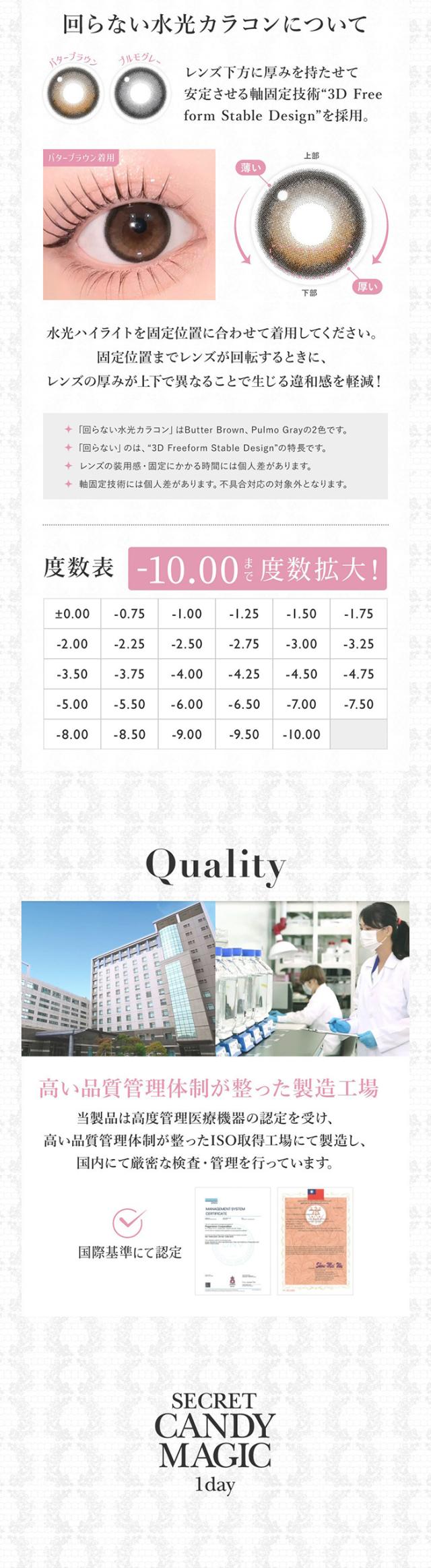 | 度数 | ±0.00、-0.75〜-5.00 (0.25ステップ)-5.50〜-10.00 (0.50ステップ) |