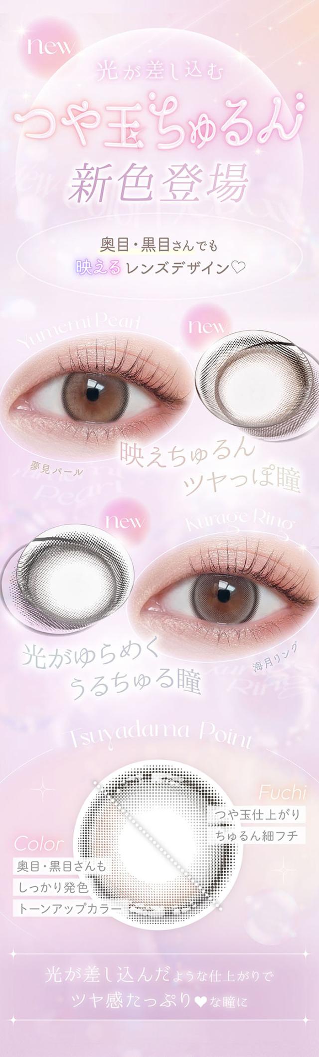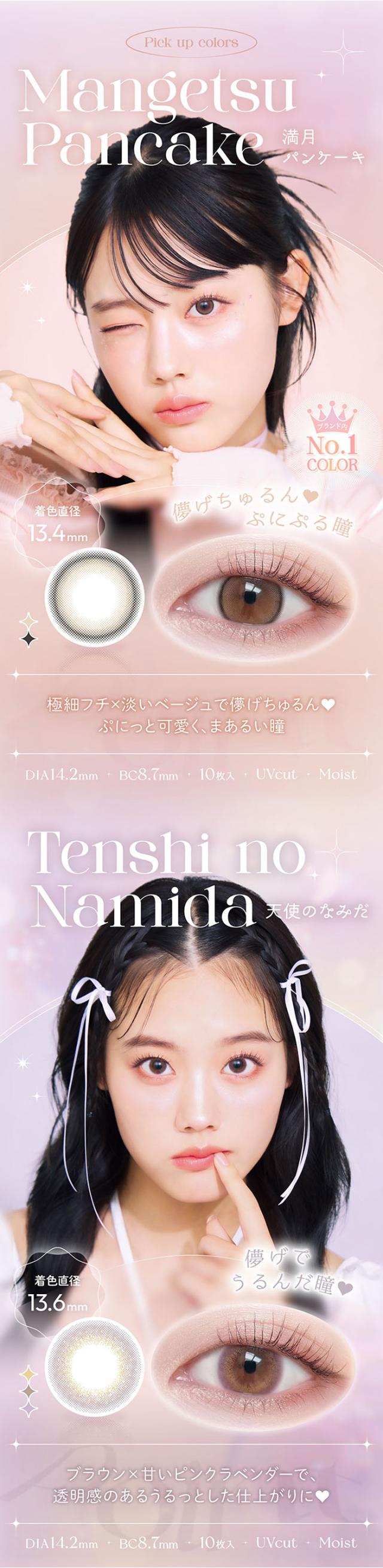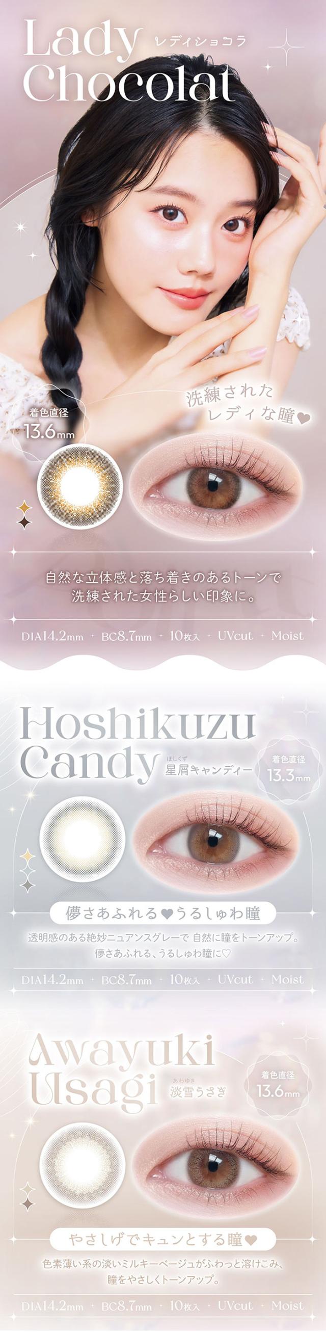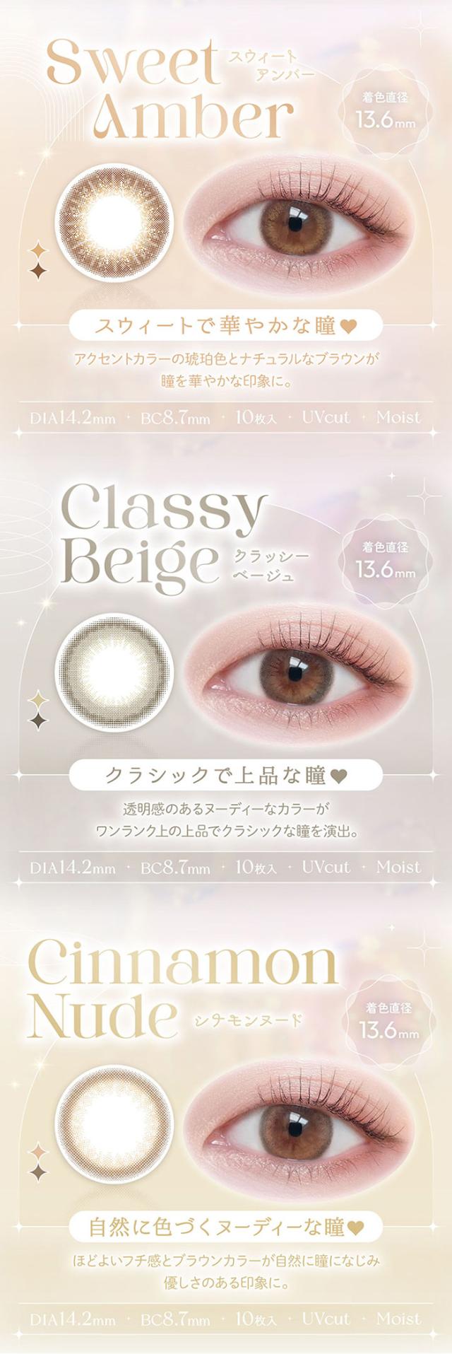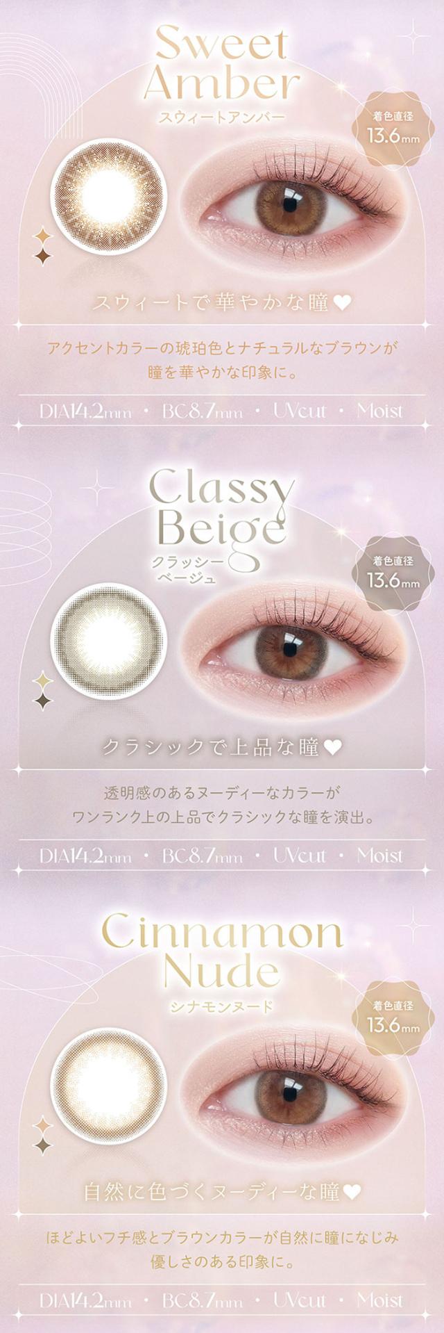 | 着色直径 | 13.3mm:星屑キャンディー 13.4mm:海月リング/満月パンケーキ 13.6mm:夢見パール/淡雪うさぎ/天使のなみだ/レディショコラ/スウィートアンバー/クラッシーベージュ/シナモンヌード |