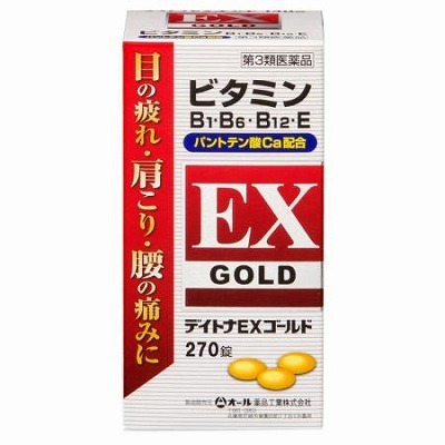 デイトナEXゴールドはビタミンB1誘導体フルスルチアミン塩酸塩,ビタミンB6,ビタミンB12を主成分とし,更にビタミンE,ガンマーオリザノール及びパントテン酸カルシウムを配合したビタミンB1・B6・B12主薬製剤です。神経細胞・筋肉細胞に作用し,更に血行を改善し,眼精疲労,肩こり,腰痛,神経痛,手足のしびれなどの症状にすぐれた効果をあらわします。
