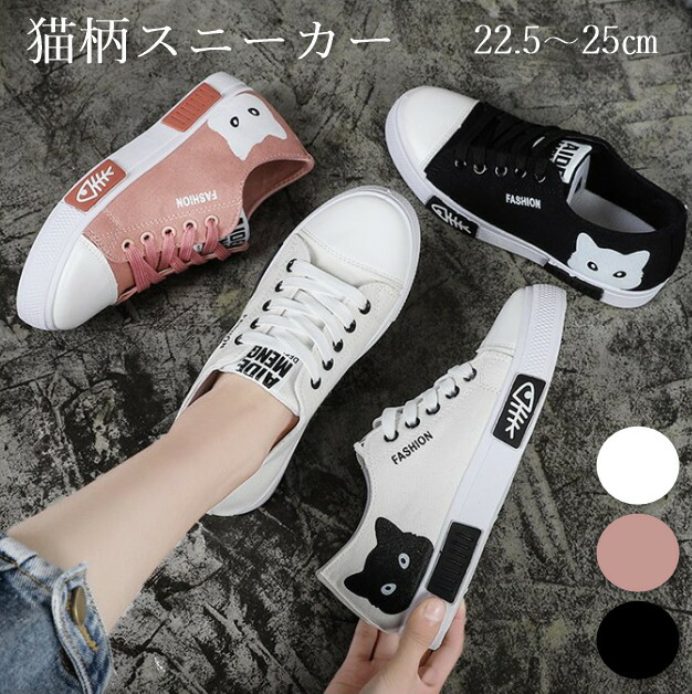 スニーカー キャンバススニーカー 韓国 靴 カジュアル レディース 子猫 猫 猫柄 にゃんこ キャット ローカット 通学 ピンク ホワイト ブラック