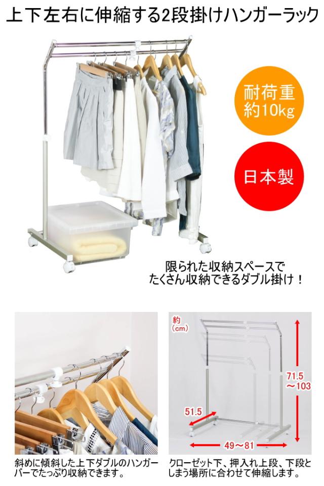 上下左右に伸縮する2段掛けハンガーラック B-537 日本製 伸縮式 ハンガーラック 収納 ダブルハンガー コートハンガー 押入れ クローゼット下 階段下 キャスター付 スチール製 燕三条製