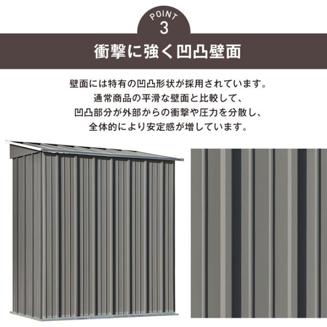 【外部からの強度を高める凹凸のある壁面】壁面の鉄板は、凹凸を付けることにより、平たい鉄板と比べて外部からの衝撃に強くなっています。
