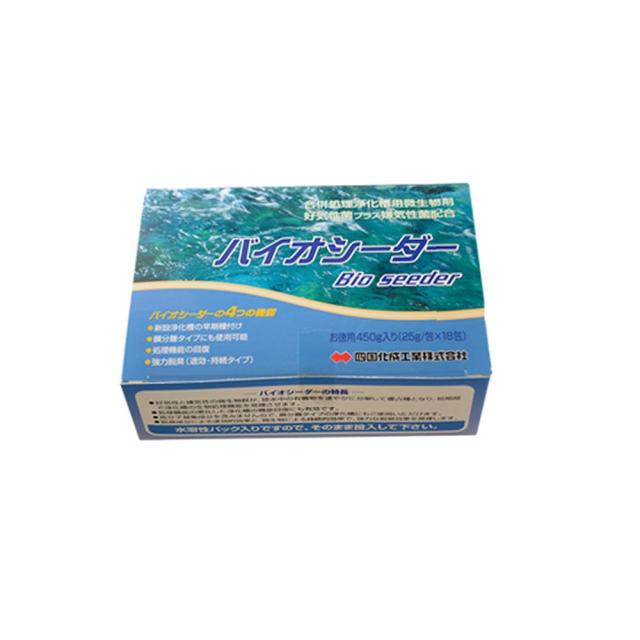 バイオシーダーは、家庭用浄化槽・各浄化槽に対する機能回復・維持させる為には効果的です。 新設浄化槽の早期種付けにもご使用頂けます。 ●好気性と嫌気性の微生物郡が、排水中の有機物を速やかに分解して優先種となり、短期間で浄化槽の生物処理機能を発揮させます。 ●処理機能の悪化した浄化槽の機能回復にも有効です。 ●浄化槽の悪臭除去と発生防止にもなります ●高分子凝集成分を含みませんので、膜分離タイプの浄化槽にもご使用いただけます。 ●脱臭成分による速効的効果と、微生物による持続的効果で、強力な脱臭効果を発揮します。 【使用方法】 ・新設浄化槽の種付け:水張り後、ブロワーの運転を開始した後、嫌気濾過槽に12包を投入して下さい。 ・膜分離タイプ浄化槽の種付け:本剤添加量の40%~50%が速やかにMLSSに変換します。必要とされるMLSSから、本剤用量を計算し、嫌気濾床槽に投入して下さい。 ・定期清掃後の種付け:嫌気濾過槽に8包を投入して下さい。 ・処理機能の回復:嫌気濾過槽に8包を投入して下さい。 ・悪臭の脱臭:トイレから2~3包を流して下さい。