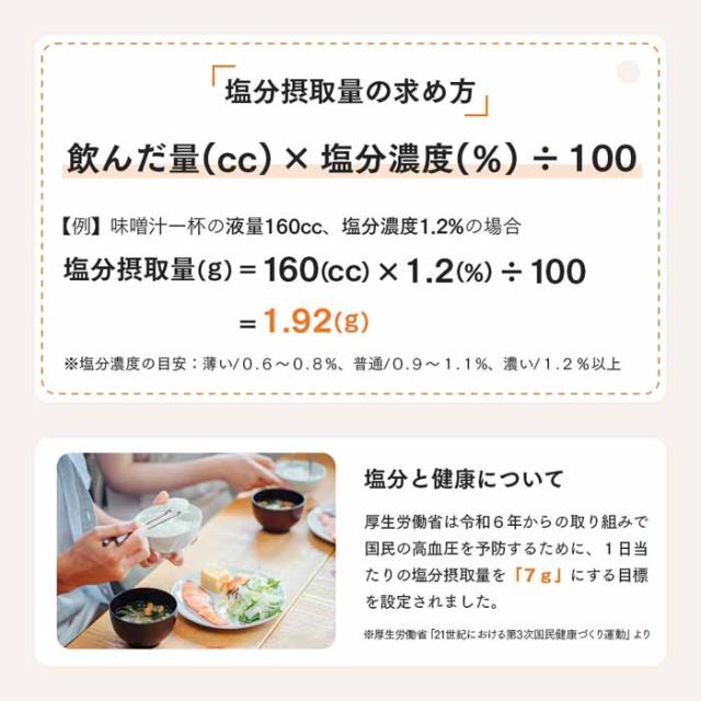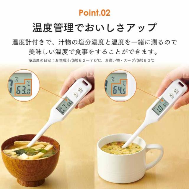 | 塩分の取りすぎ予防に「はかって食べる」習慣作り!味噌汁・お吸い物・スープなどの汁物の塩分濃度が簡単にはかれます。温度管理もできておいしさアップ!※おいしい温度…味噌汁62〜70℃、お吸い物・スープ60℃ | |