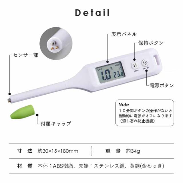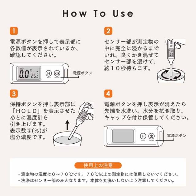 | 1)測定準備 (1)キャップを取り外し、センサー部が汚れていないか確認してください。汚れている場合は、センサー部をよく水洗いしてください。 (2)電源ボタンを押して、表示部に各数値が表示されることを確認してください。 2)測定 (1)表示部右上に「HOLD」と表示されていないことを確認してください。表示されている場合は保持ボタンを押して「HOLD」を解除してください。 (2)センサー部が測定物の中に完全に浸かるまで入れ、よくかき混ぜてください。その後、センサー部を浸けたまま約10秒お待ちください。 (3)保持ボタンを押し「HOLD」を表示させた後、引き上げてください。 3)測定が終わったら (1)電源ボタンを押して表示が消えたことを確認してください。 ※ボタン操作がないまま10分経過すると自動的に電源がオフになります。 (2)使用後はセンサー部を水洗いし、柔らかい布で水分を拭き取ってキャップを装着して保管してください。 ■塩分摂取量の求め方 飲んだ量(cc) × 塩分濃度(%) ÷ 100 = 塩分摂取量(g) 【例】味噌汁一杯の液量 160cc、塩分濃度1.2%の場合 飲んだ量160cc × 塩分濃度1.2% ÷ 100 = 塩分摂取量1.92g ■塩分と健康について 厚生労働省は国民が主体的に取り組める新たな国民健康づくり対策として「21世紀における国民健康づくり運動(健康日本21)」を推進しており、令和6年度からの「21世紀における第3次国民健康づくり運動(健康日本21(第3次))」の基本方針の中で、高血圧を予防するために一日当たりの塩分摂取量を7gにする目標(2032年度)が設定されました。ご家庭においても健康づくりの第一歩として、塩分濃度計を活用して日々の塩分摂取量を把握し、塩分を控えた食生活を送ることが大切となっています。 | |