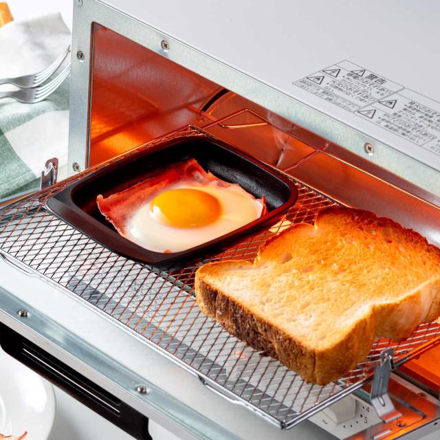 目玉焼きがトースターであっという間にできあがる、便利な角型プレートです。コンパクトなサイズ感でトーストと並べて焼くこともできるので時短になり、忙しい朝の時間に大活躍です。