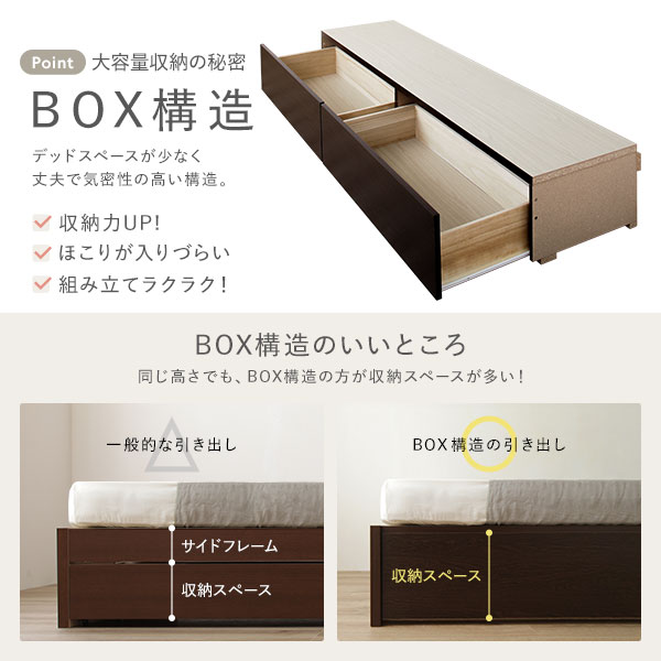 一般的な引き出しと比べ、同じ高さでも、BOX構造の方が収納スペースが多い!
