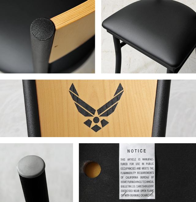 レーザー彫刻されたU.S.AIR FORCEの公式ロゴが印象的な木製バックのダイニングチェアです。どんなお部屋にもマッチするブラックと木目を生かしたカラーリング。インパクトのある配色ながら落ち着いた雰囲気があります。堅牢な造りで、欠けや傷に強く、キレイな外観を保ってくれるパウダーコートスチールのフレーム。座面は高密度でしっかりと張りのあるポリウレタンフォームに、高級感のあるレザー調の生地が貼られています。