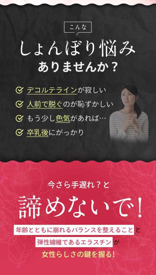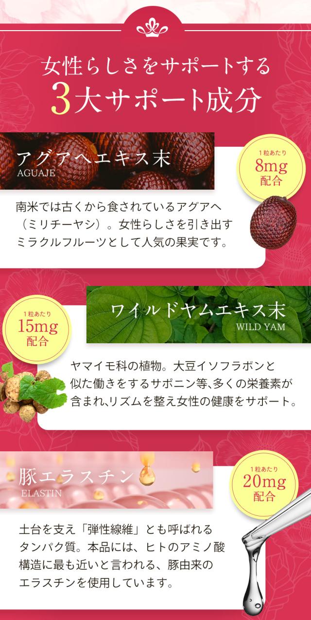 亜麻仁油(ニュージーランド製造)、豚エラスチン、ワイルドヤムエキス末、ザクロ種子エキス末、マカ末、アグアへエキス末、ビタミンE含有植物油、大豆胚芽エキス末(イソフラボン含有)、豚プラセンタエキス末 / ゼラチン、グリセリン、ミツロウ、グリセリン脂肪酸エステル、植物レシチン