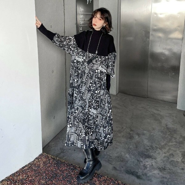☆ゆったりデザインのオシャレな柄デザイン生地ワンピース