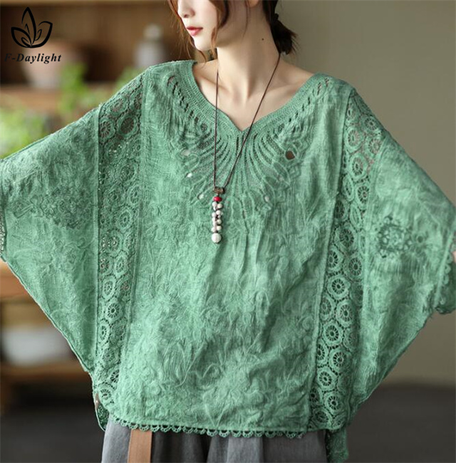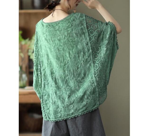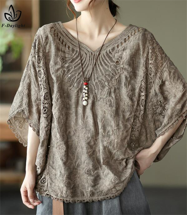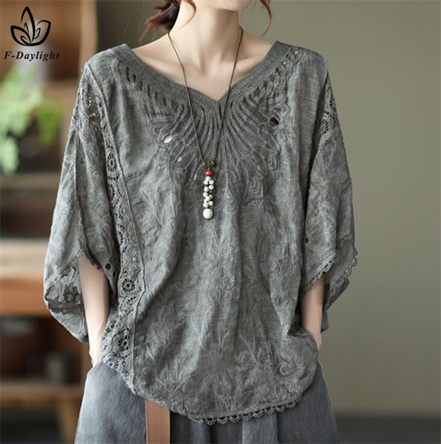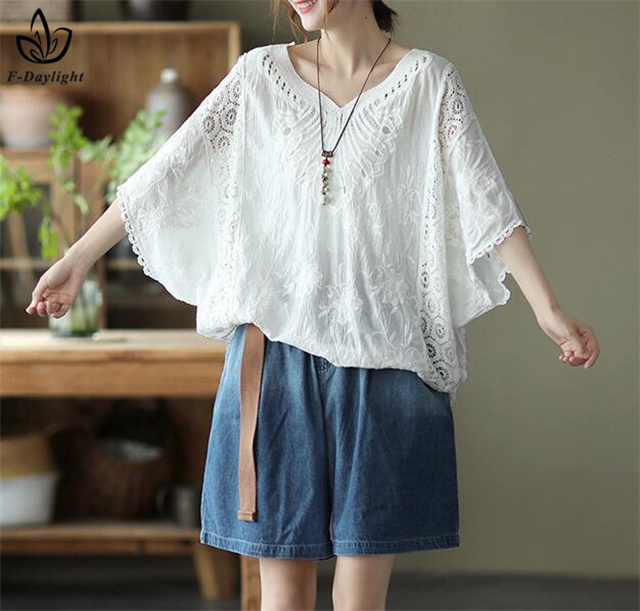 レース刺繍トップス レディース トップス ブラウス 7分袖 半袖 ゆったり ドルマン 刺繍 綿 コットン オーバーサイズ 大きいサイズ tシャツ シャツ 大人