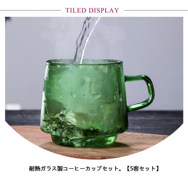 | 耐熱ガラス製コーヒーカップセット。【5客セット】 紅茶・コーヒー約1杯分の、小ぶりのサイズ感と、コロンと可愛らしいフォルムが特徴。 透明感のある美しいカラーがテーブルを華やかに彩り、来客時のおもてなしにもぴったりです。 厚手の耐熱ガラスでできているので、通常のガラスカップよりも耐久性があります。 透明なので、緑茶・紅茶・コーヒーなど入れたものの色味を楽しむことも。 ご自身用にはもちろん、ギフトにもおすすめです。 | |