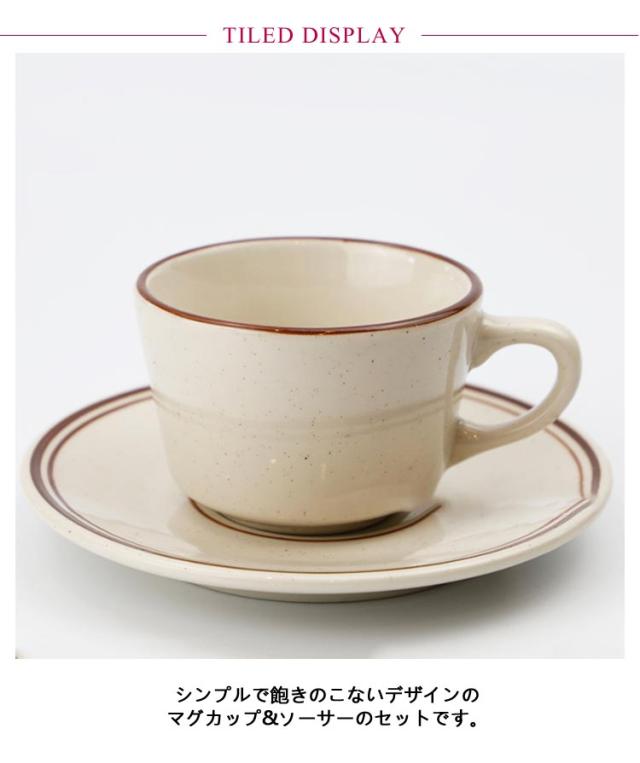 | シンプルで飽きのこないデザインのマグカップ&ソーサーのセットです。【5客セット】 陶器製で電子レンジ・食洗器も対応可能です。 普段使いにちょうどいい約210mlのコーヒーが入ります。 珈琲以外にも様々な飲み物を入れてお楽しみください。 | |