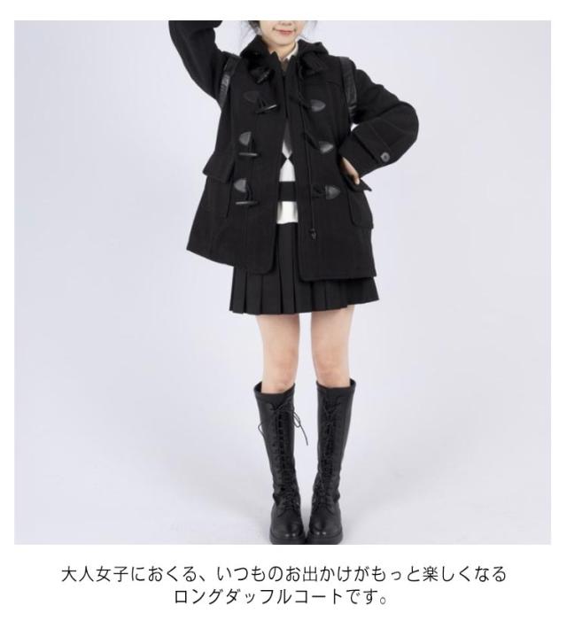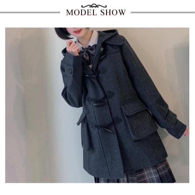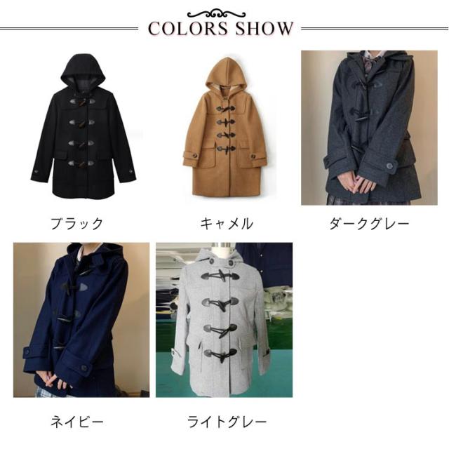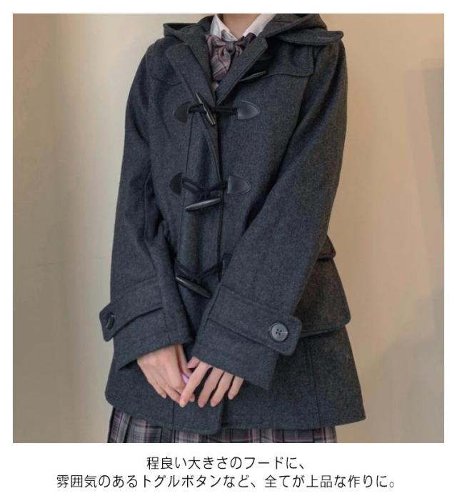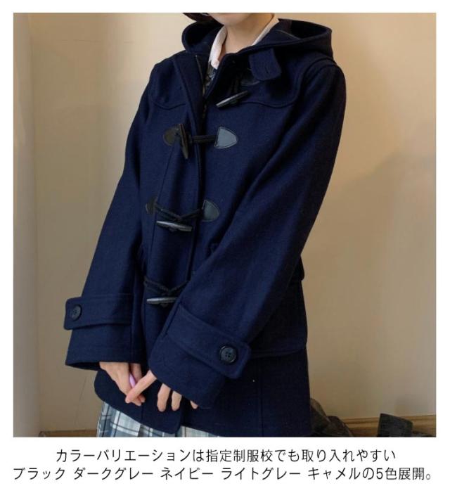 | 軽いウールコートの感覚で羽織れる大人カジュアルコートです。 程良い大きさのフードに、雰囲気のあるトグルボタンなど、全てが上品な作りに。 すっきり見えるデザインですが、ブレザーやセーラー服の上に着用しても窮屈感のないサイズ感にこだわりました。 また、首元までボタンを閉める事が出来ますので、防寒性にも優れています。 カラーバリエーションは指定制服校でも取り入れやすいブラック ダークグレー ネイビー ライトグレー キャメルの5色展開。 大人女子におくる、いつものお出かけがもっと楽しくなるロングダッフルコートです。 | |