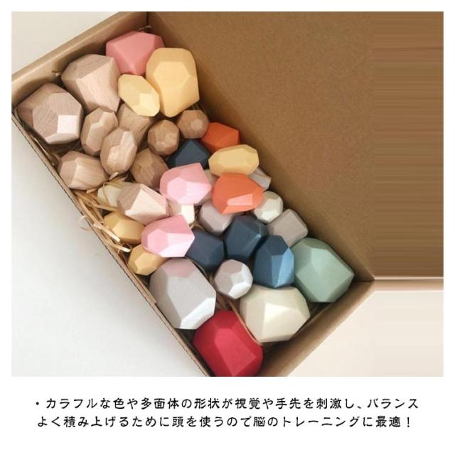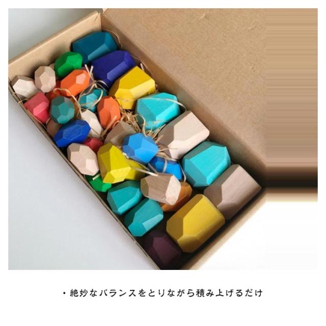 | ・一つ一つが石のような複雑な形に切り出された積み木です。 ・絶妙なバランスをとりながら積み上げるだけ。 ・カラフルな色や多面体の形状が視覚や手先を刺激し、バランスよく積み上げるために頭を使うので脳のトレーニングに最適! ・子どもの手で握りやすい大きさで、積み上げるには集中力とバランス感覚が鍛えられそう。 ・遊んだあとは置いておくだけでも存在感抜群のオブジェに! | |